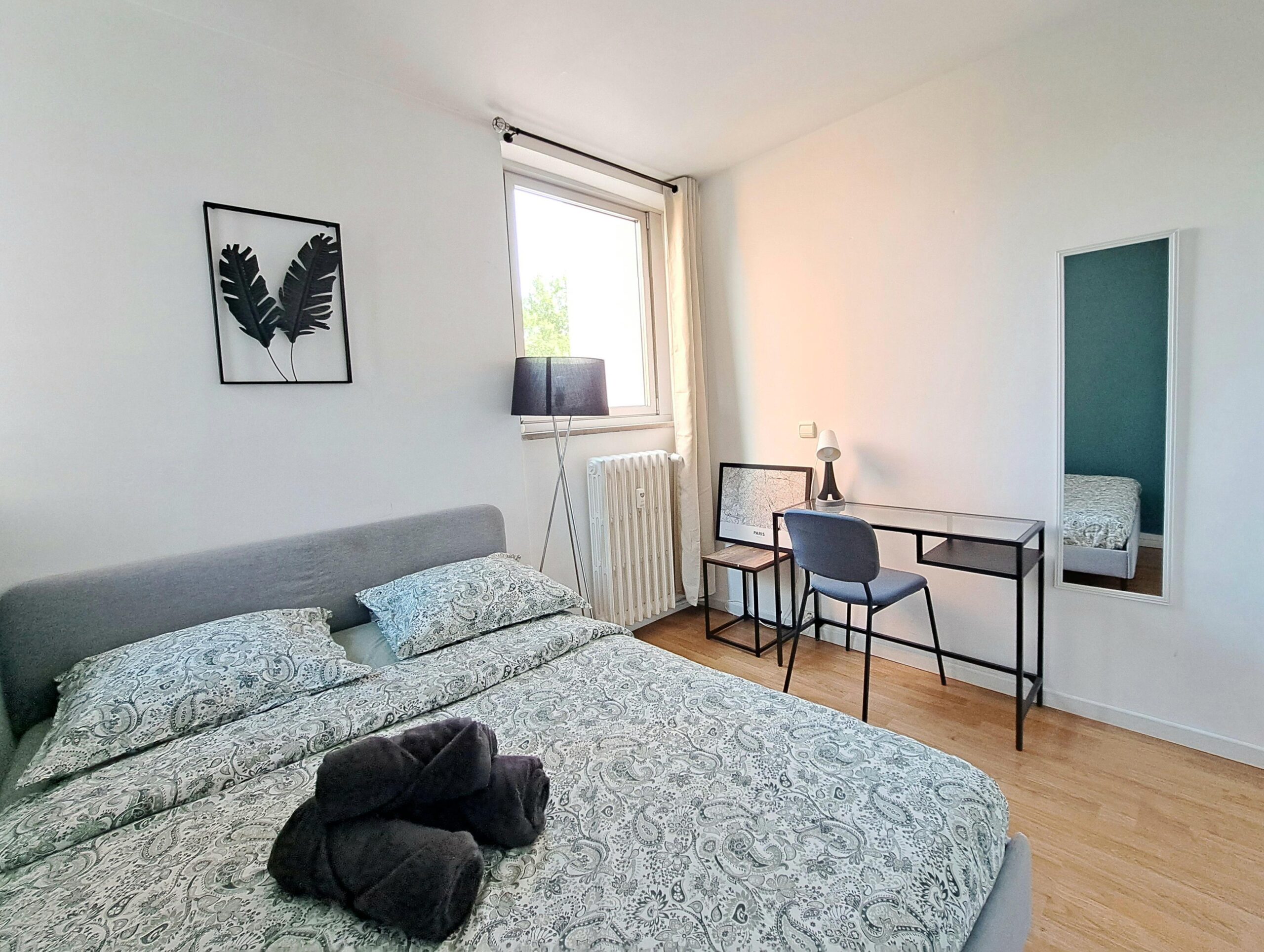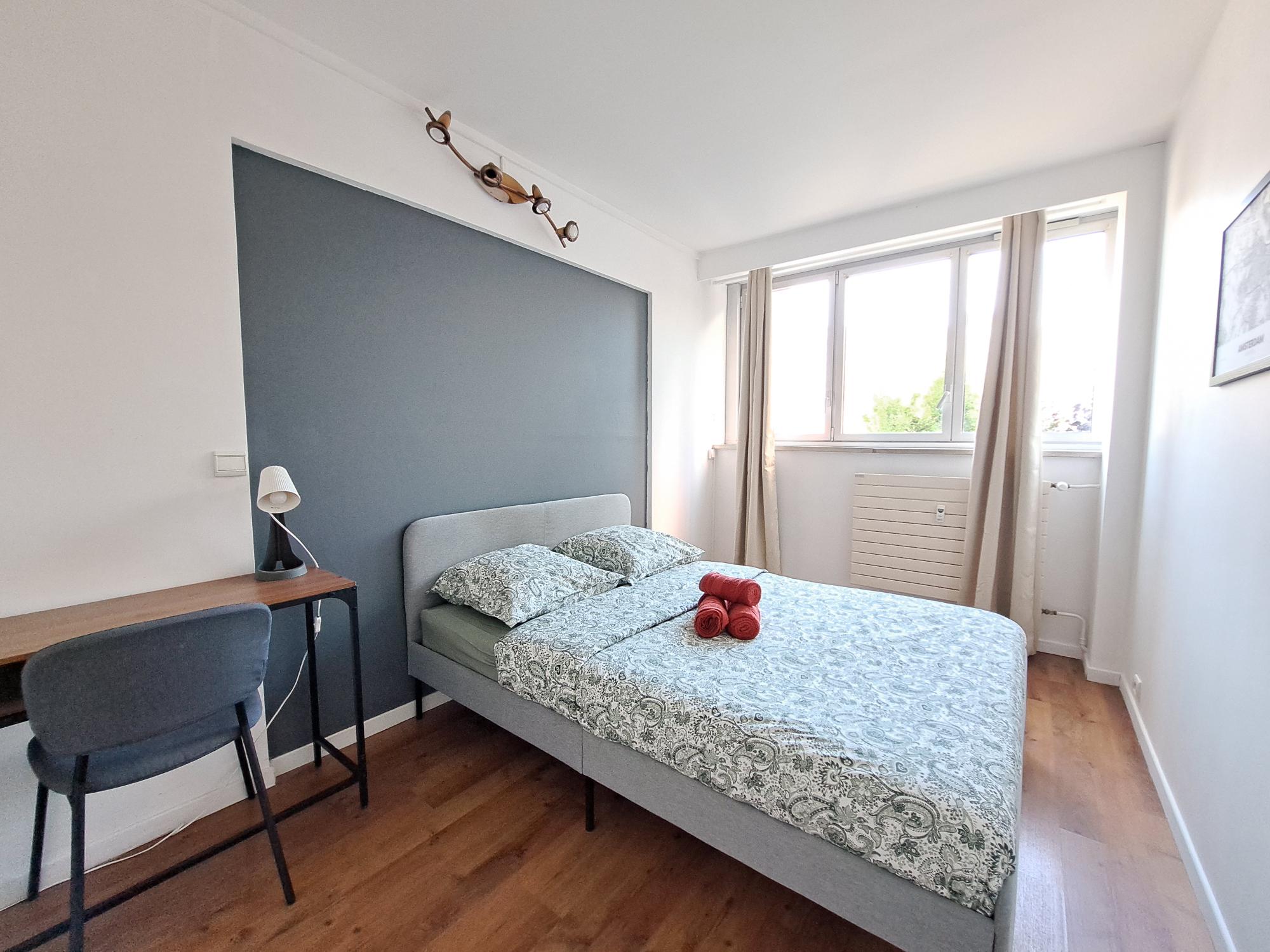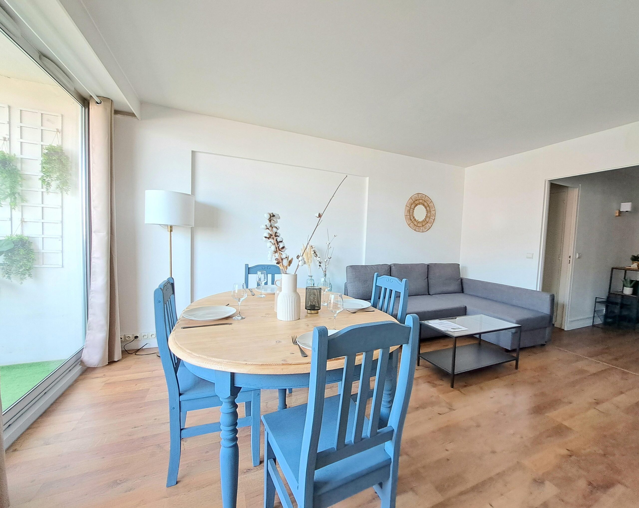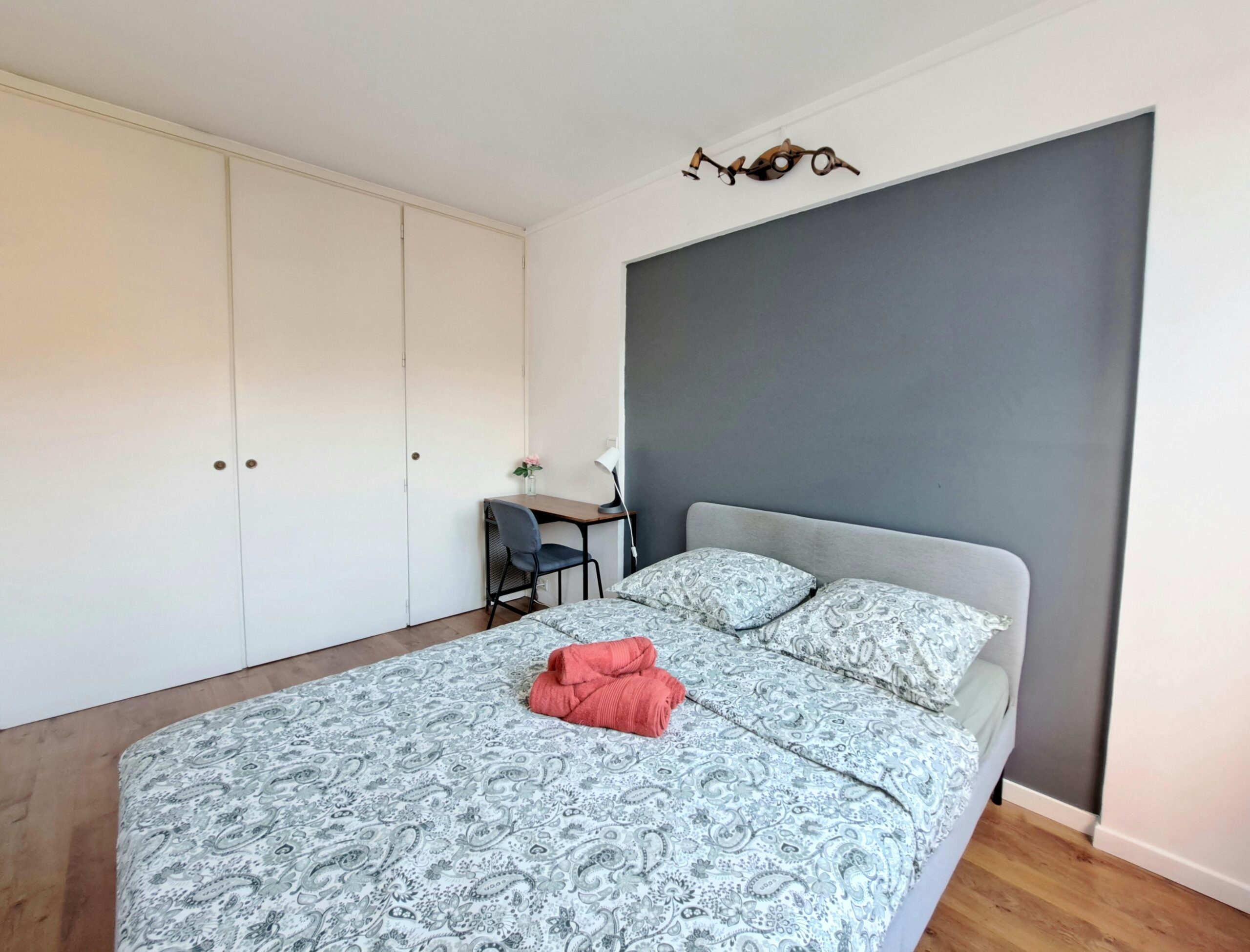 L’appartement offre un vaste salon baigné de lumière, avec un coin repas convivial, donnant accès à un grand balcon rénové, parfait pour se détendre ou partager un moment en extérieur. La cuisine, entièrement équipée, comprend notamment une machine à café pour démarrer la journée en douceur, et s’ouvre sur un espace buanderie avec machine à laver et sèche-linge. Deux salles de bain sont à votre disposition : l’une avec baignoire, l’autre avec douche. Les quatre chambres, toutes équipées d’un lit double (140 cm), disposent chacune d’un bureau et d’un dressing, pour un confort optimal. Le linge de maison et les serviettes de bain sont fournis, afin que vous vous sentiez chez vous dès votre arrivée.