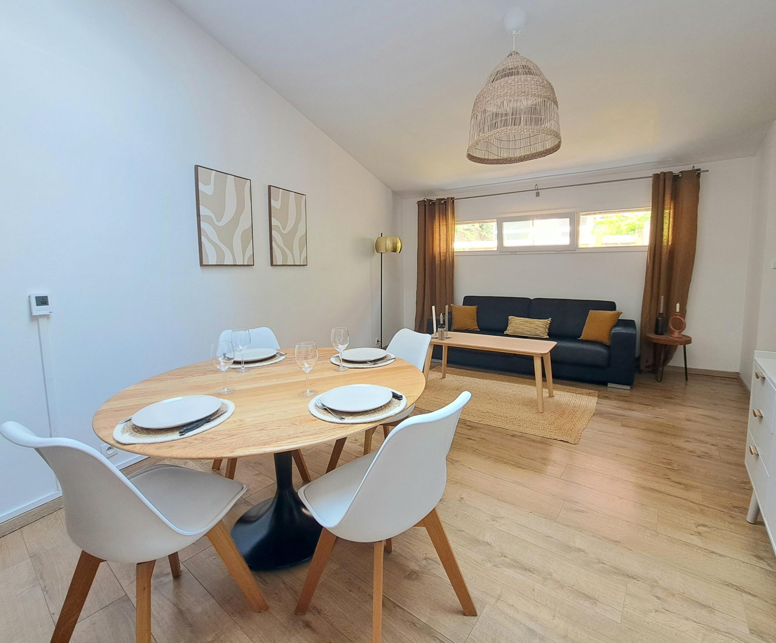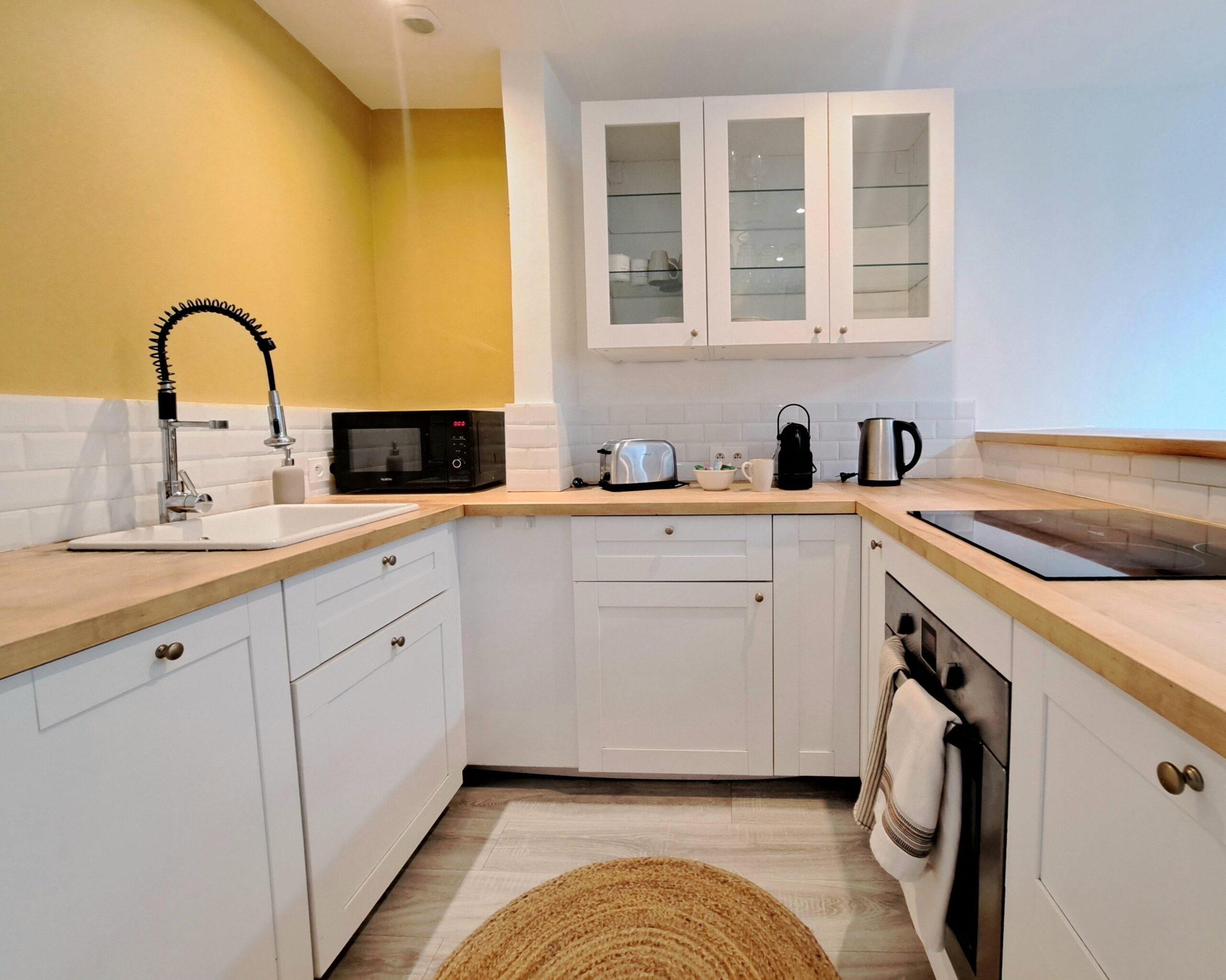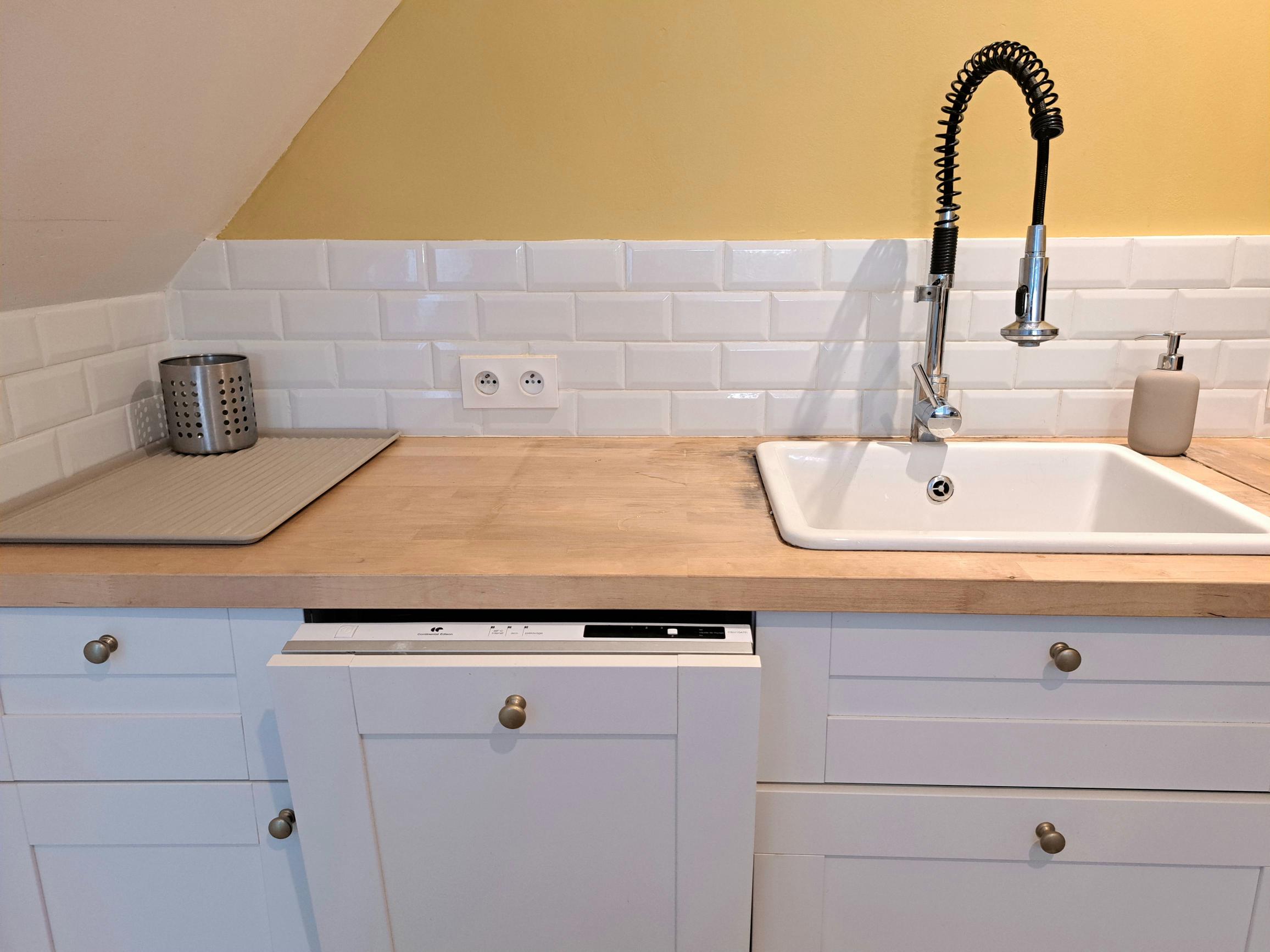 Une fois dans la maison, vous découvrirez la pièce de vie composée d’un salon/salle à manger, puis une cuisine semi-ouverte comprenant tout le nécessaire pour cuisiner, ainsi qu’un lave-vaisselle.