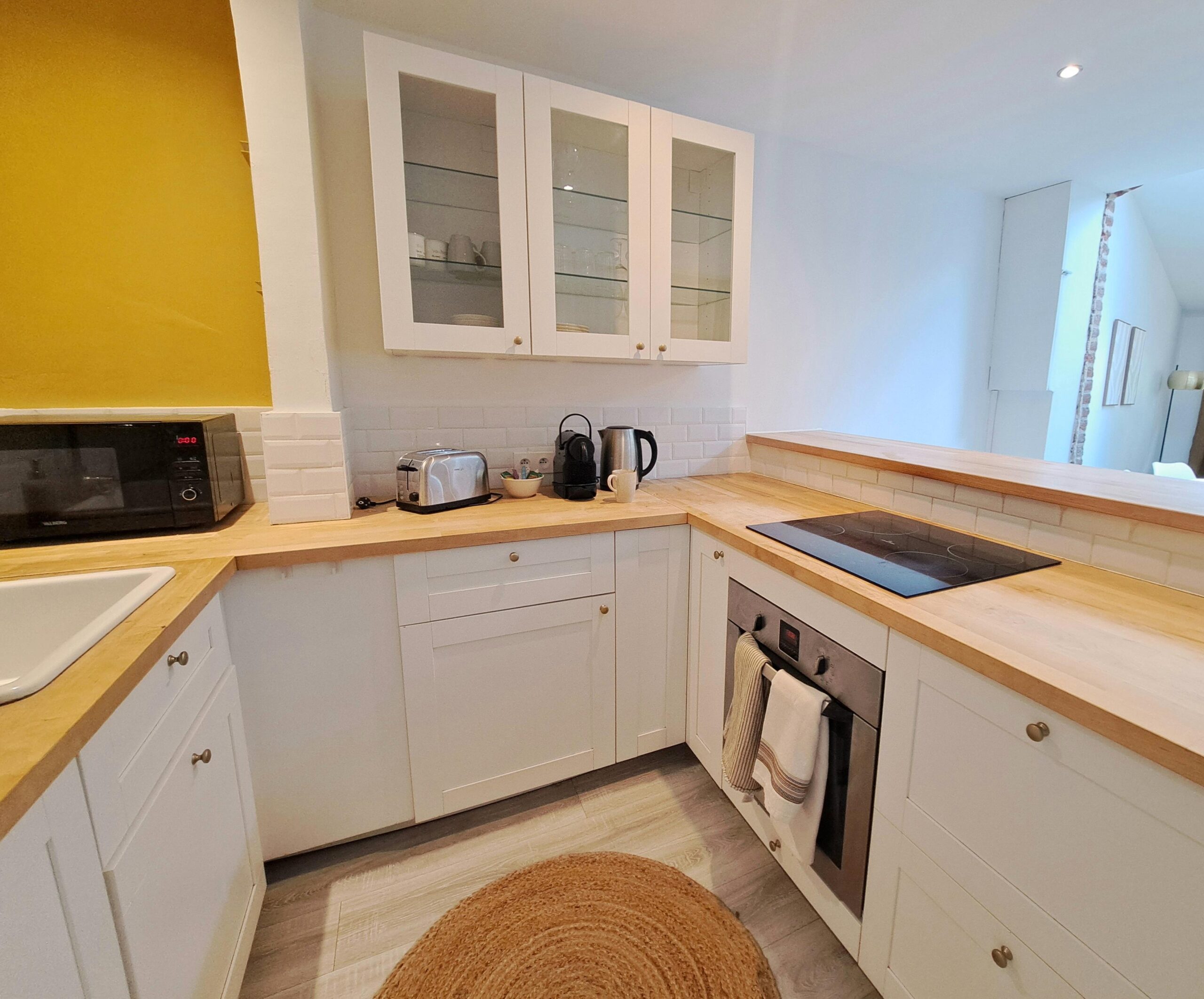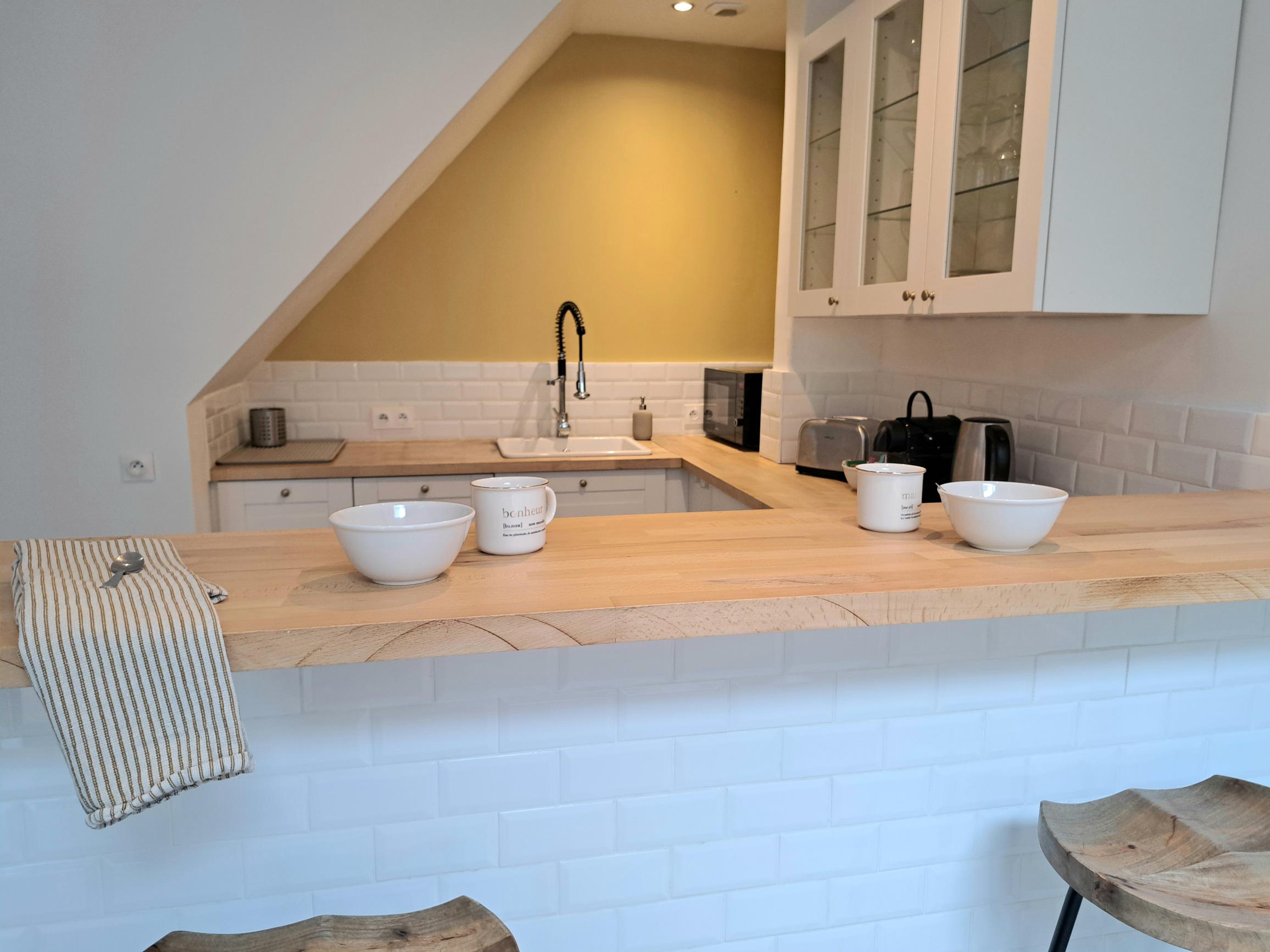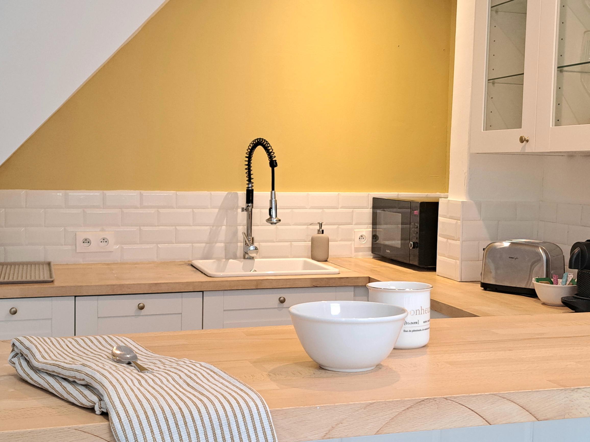 Une fois dans la maison, vous découvrirez la pièce de vie composée d’un salon/salle à manger, puis une cuisine semi-ouverte comprenant tout le nécessaire pour cuisiner, ainsi qu’un lave-vaisselle.