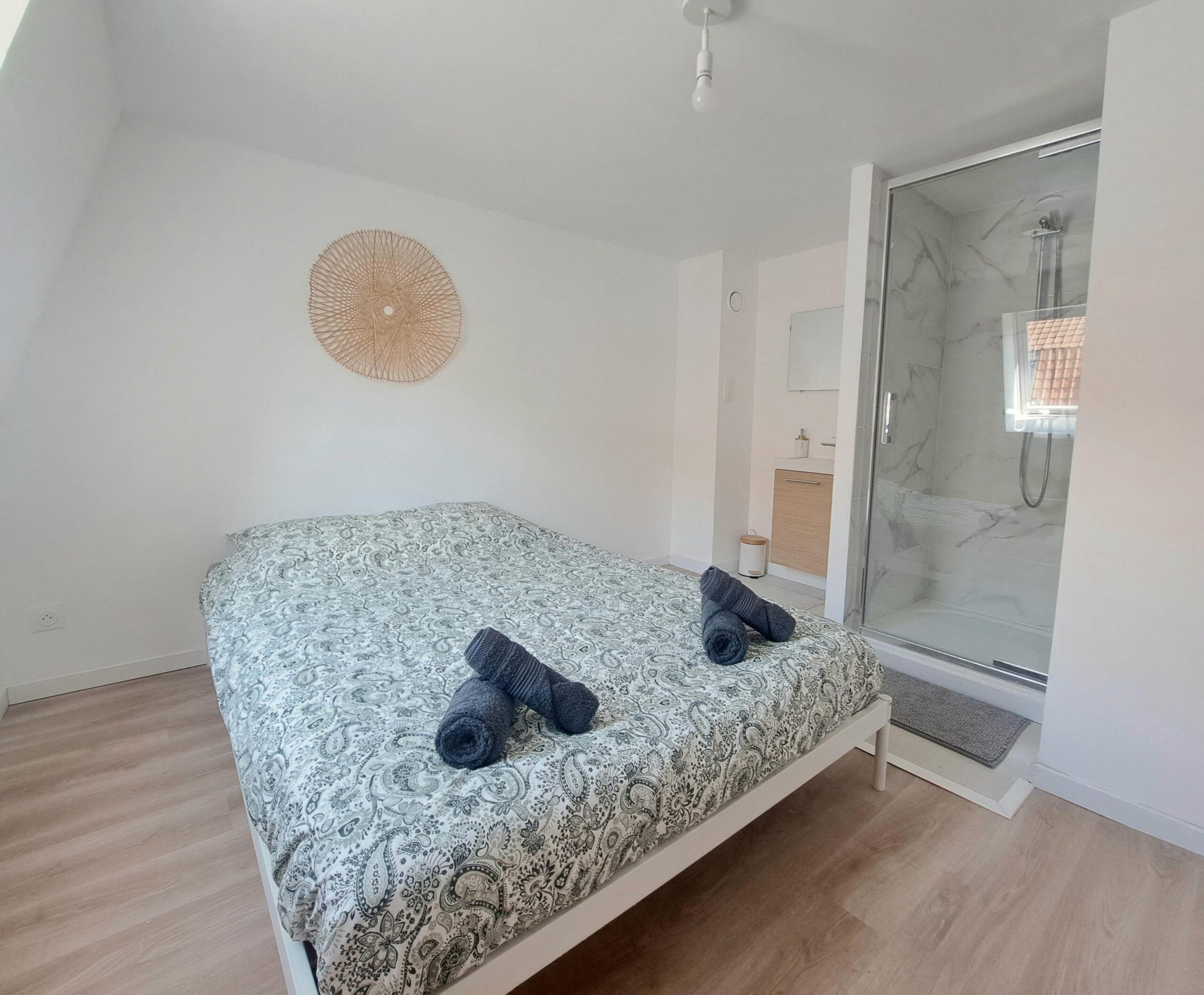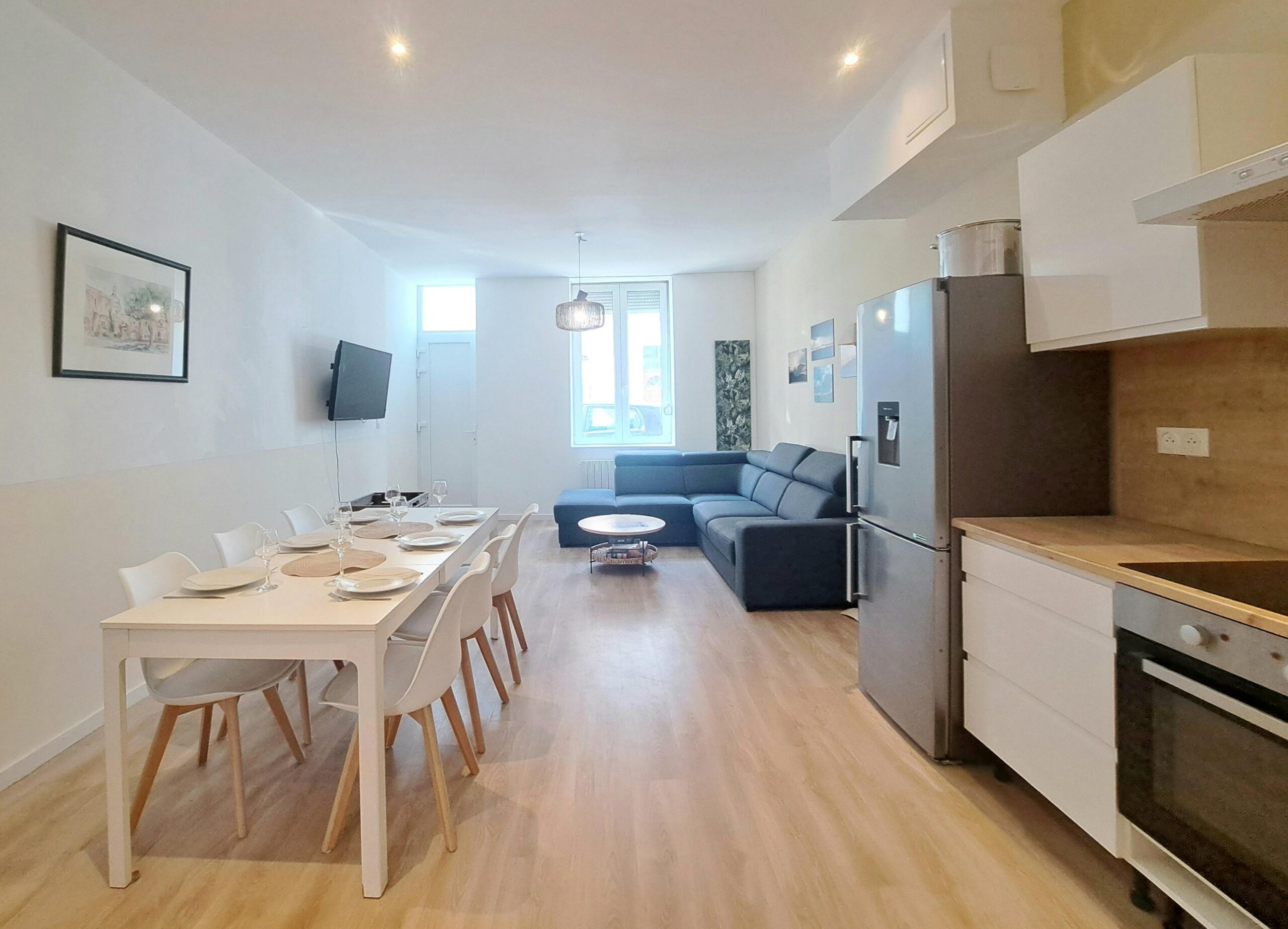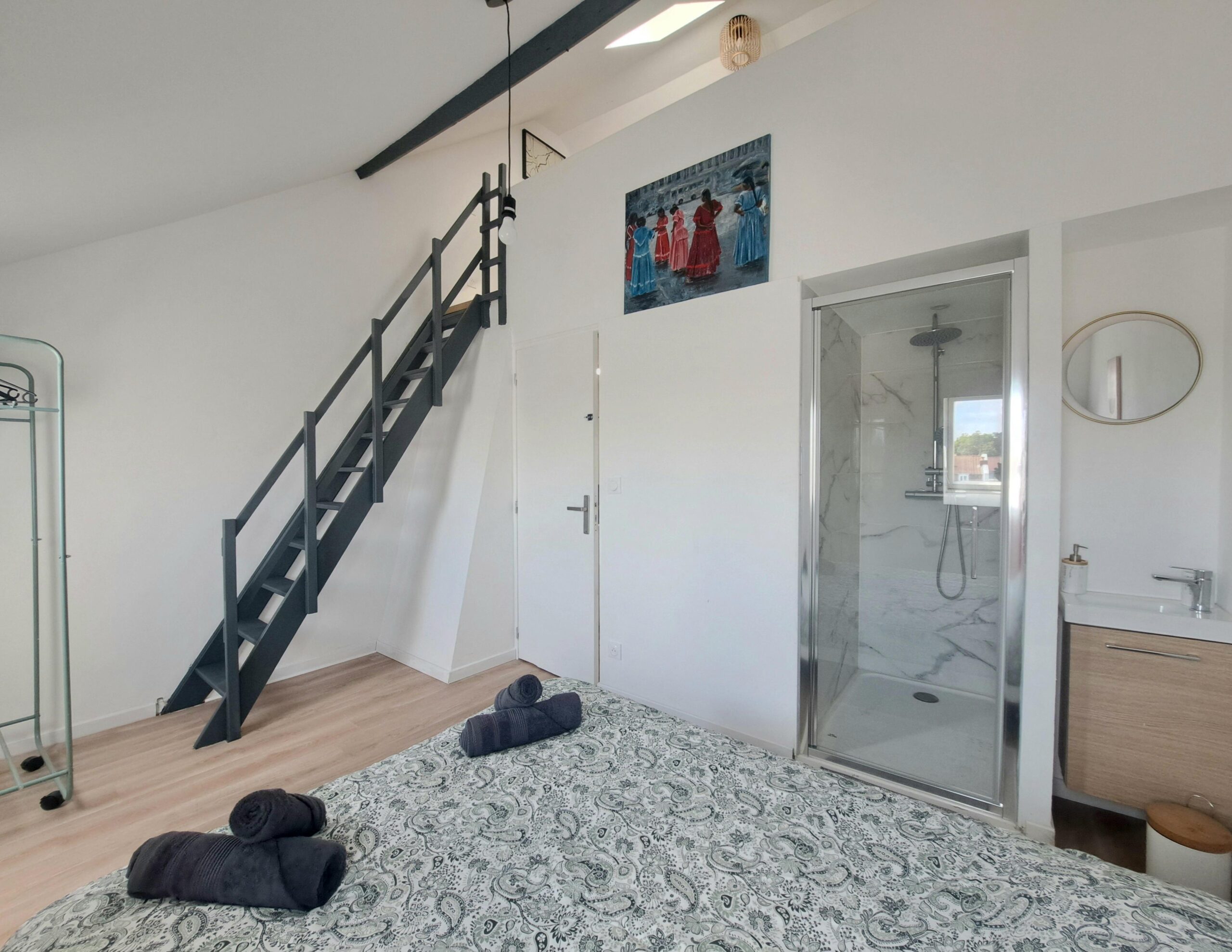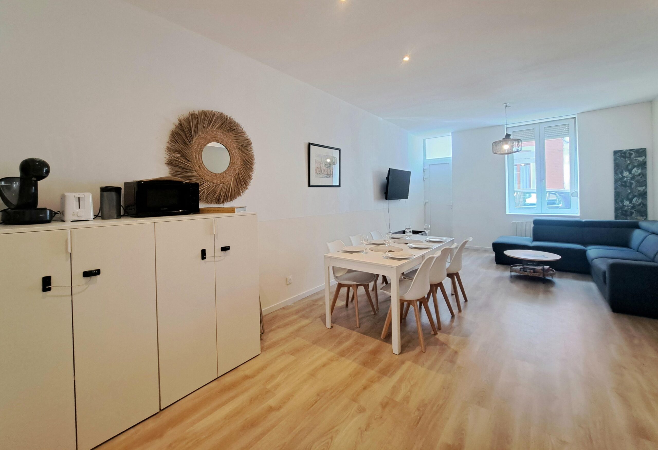 Cette maison allie espace, confort et charme. Ses deux étages lumineux offrent cinq chambres décorées avec soin, chacune équipée de literie de qualité et de salle de bain privative. La chambre avec mezzanine permet un couchage supplémentaire et apporte un esprit loft unique. La cuisine toute équipée invite à préparer de bons repas, tandis que le salon convivial est parfait pour se retrouver. La grande cour extérieure, entièrement réaménagée, offre un lieu idéal pour vos repas d’été ou moments de détente. Située au centre-ville, elle vous permet de rejoindre à pied restaurants, commerces et lieux culturels, tout en restant un cocon paisible après vos journées actives.