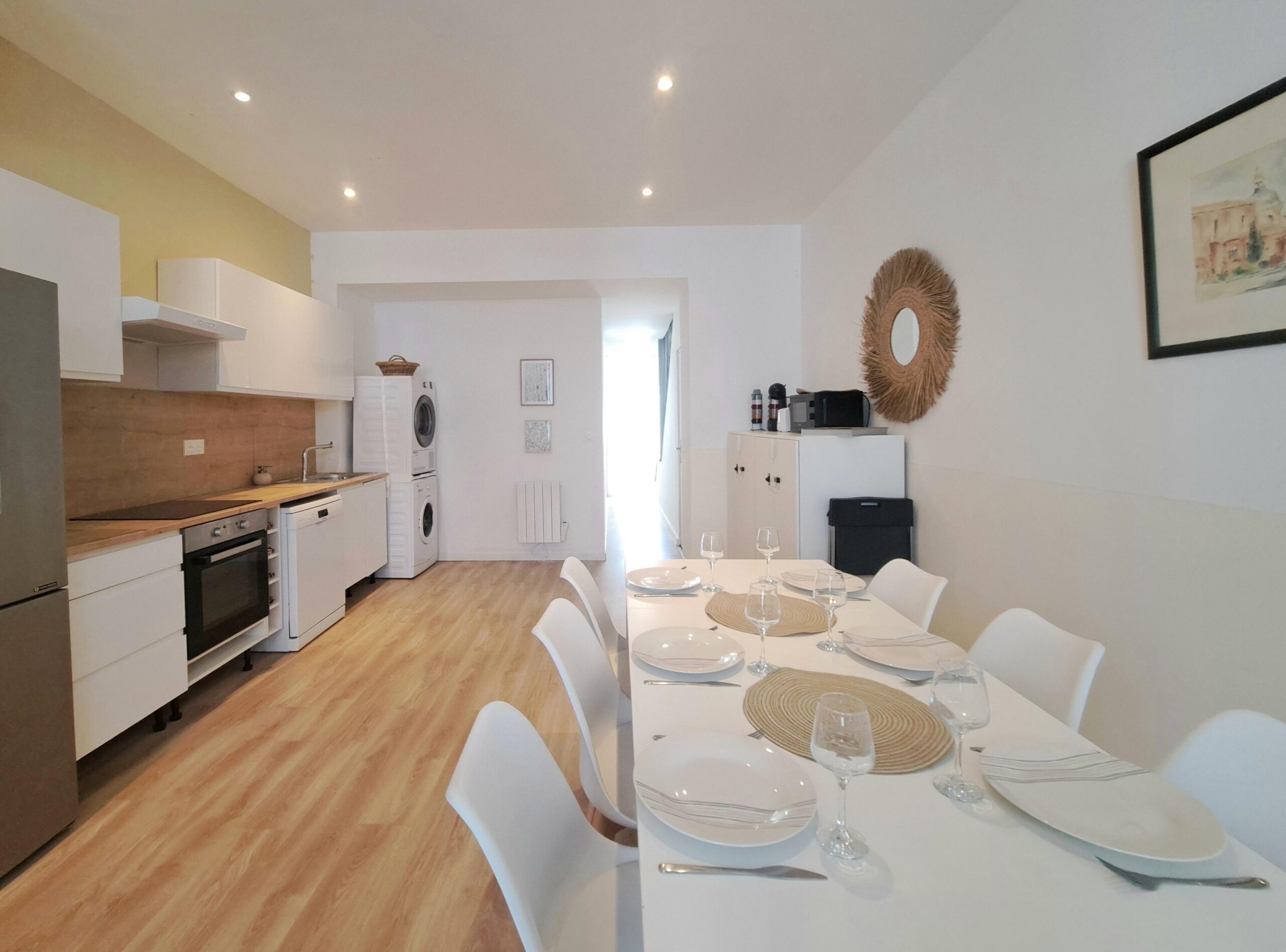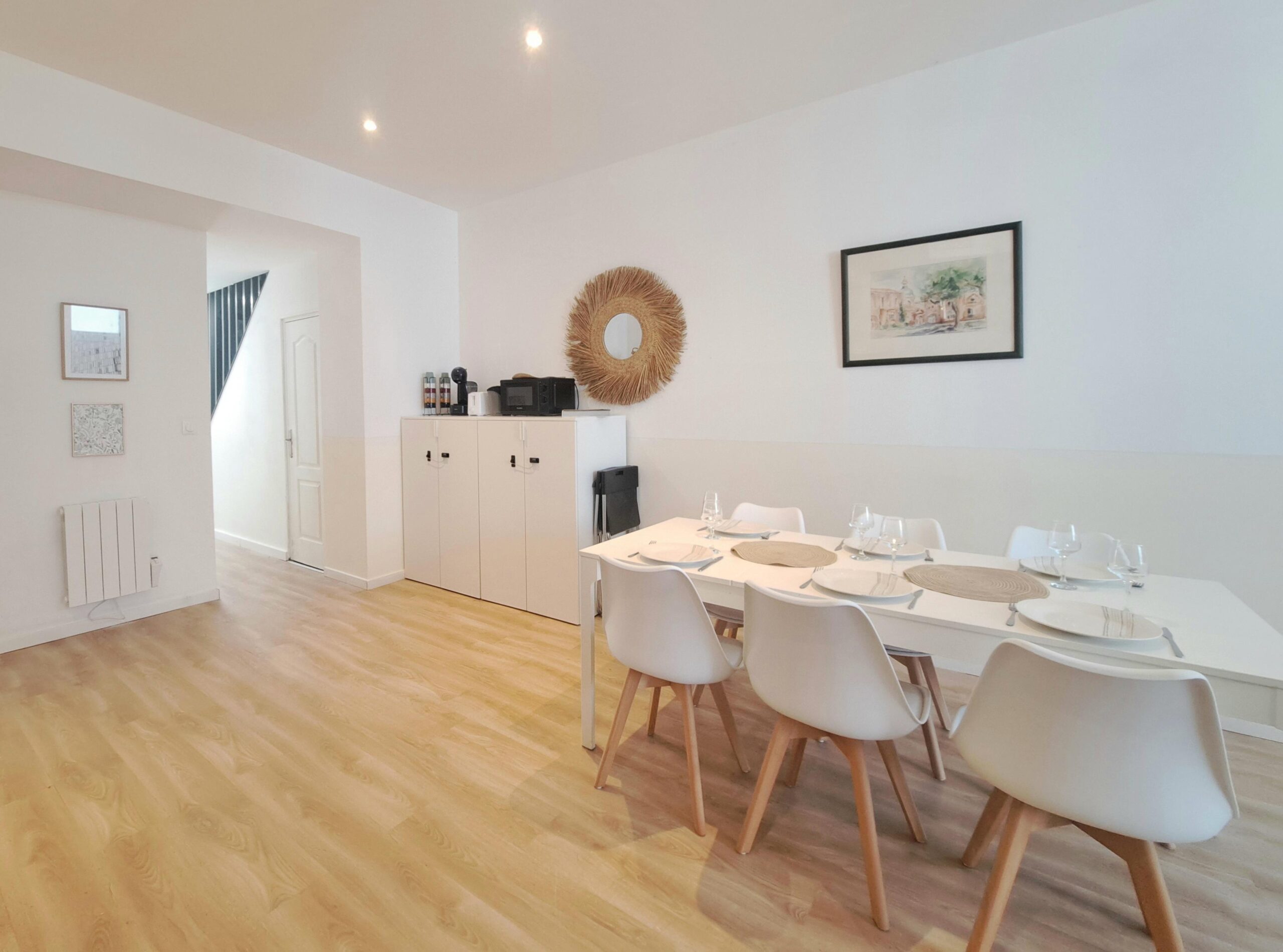 Grande maison de ville rénovée, 5 chambres avec salle de bain privative, dont une avec mezzanine et lit double supplémentaire. 6 lits doubles au total, vaste cour aménagée, idéale pour familles, amis ou séjours professionnels, en plein cœur de la ville.