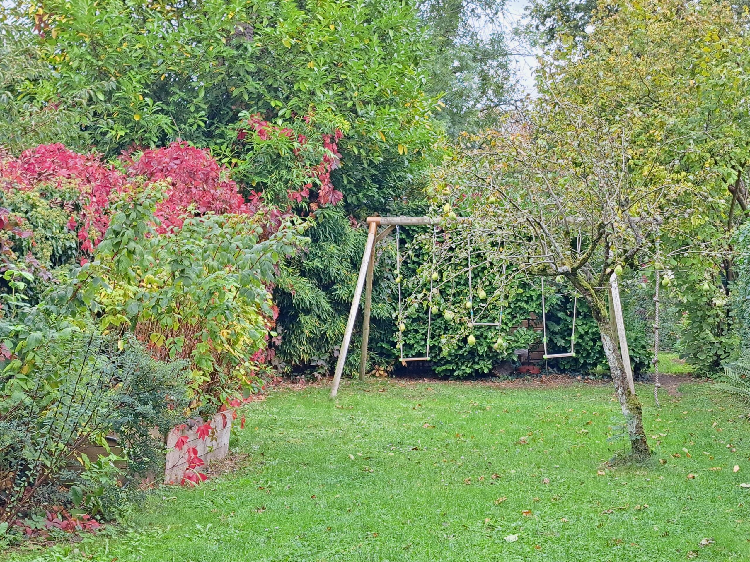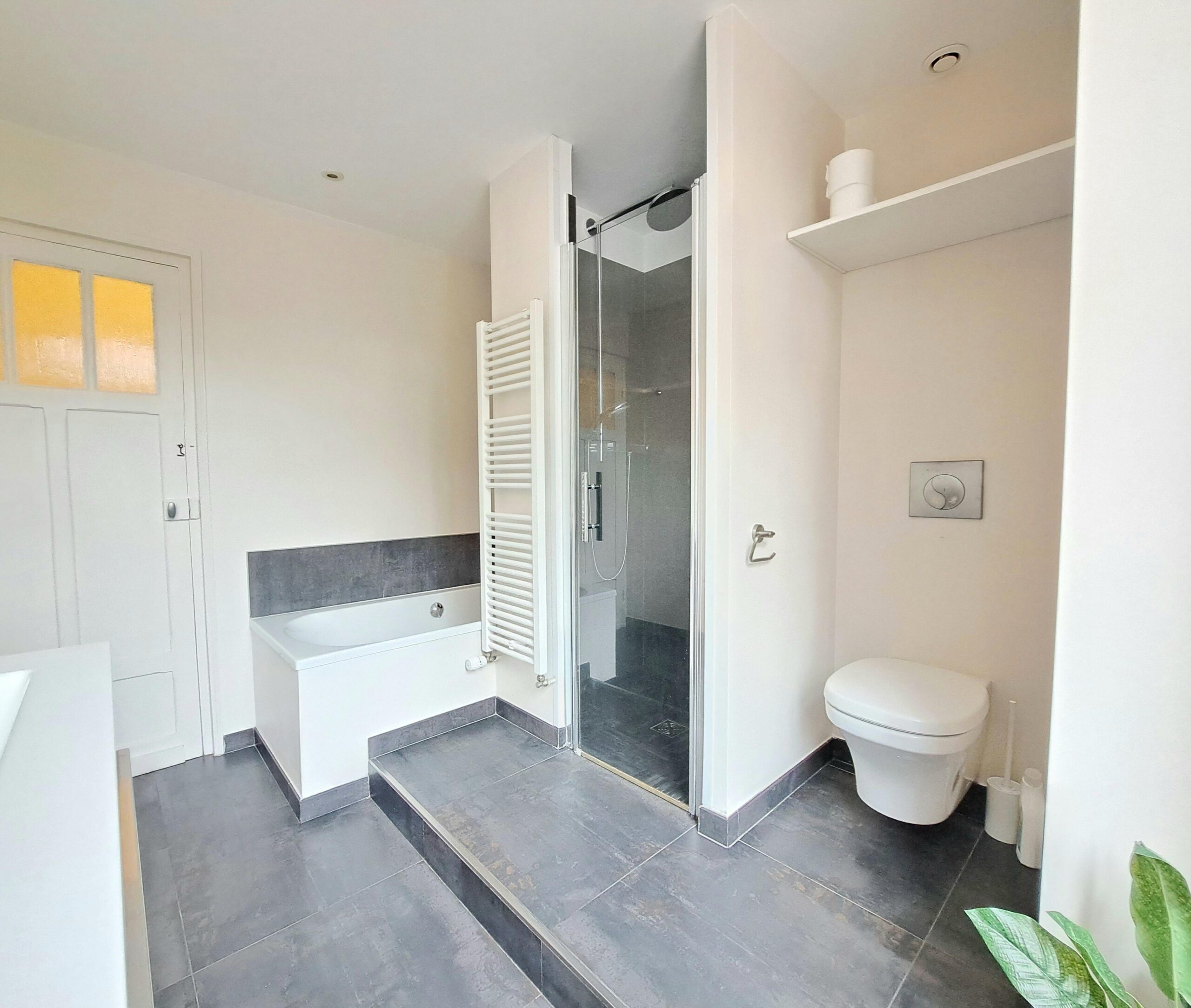 Une salle de bain avec vue sur le jardin, équipée d’une baignoire, d’une douche et de toilettes, se trouve aussi à cet étage.