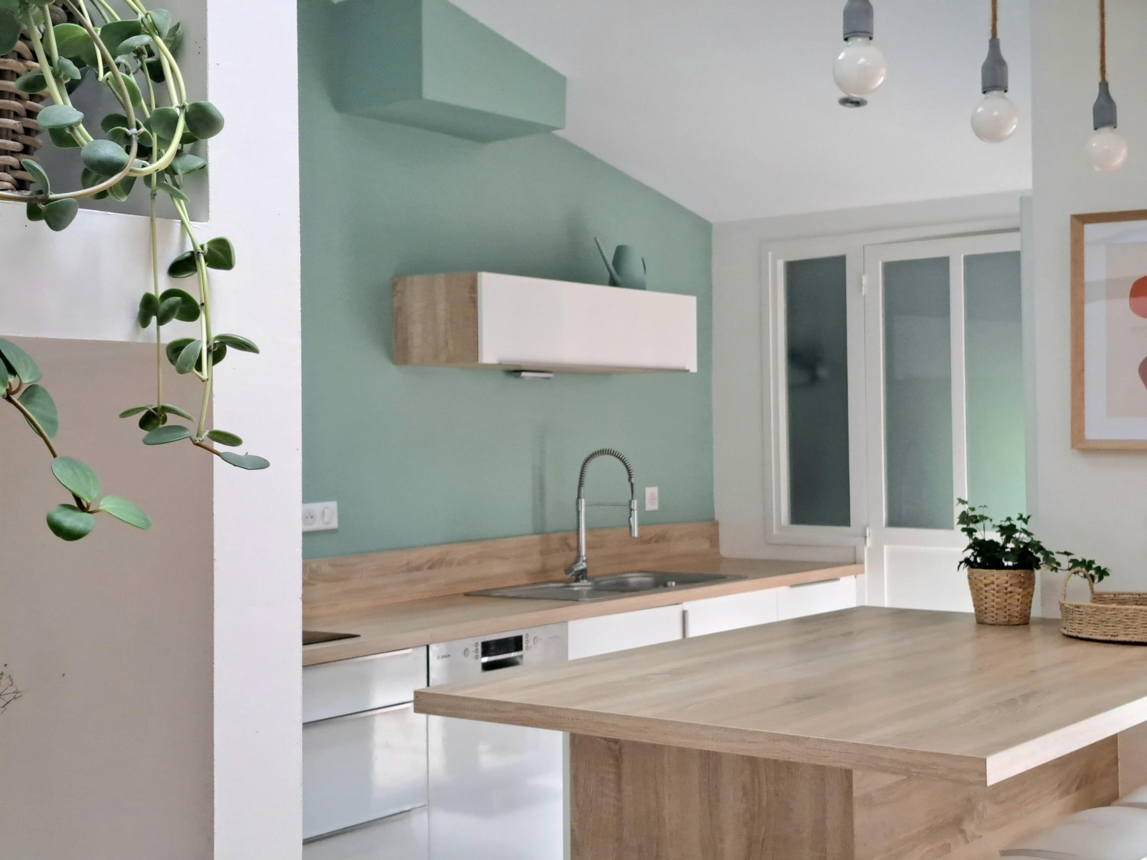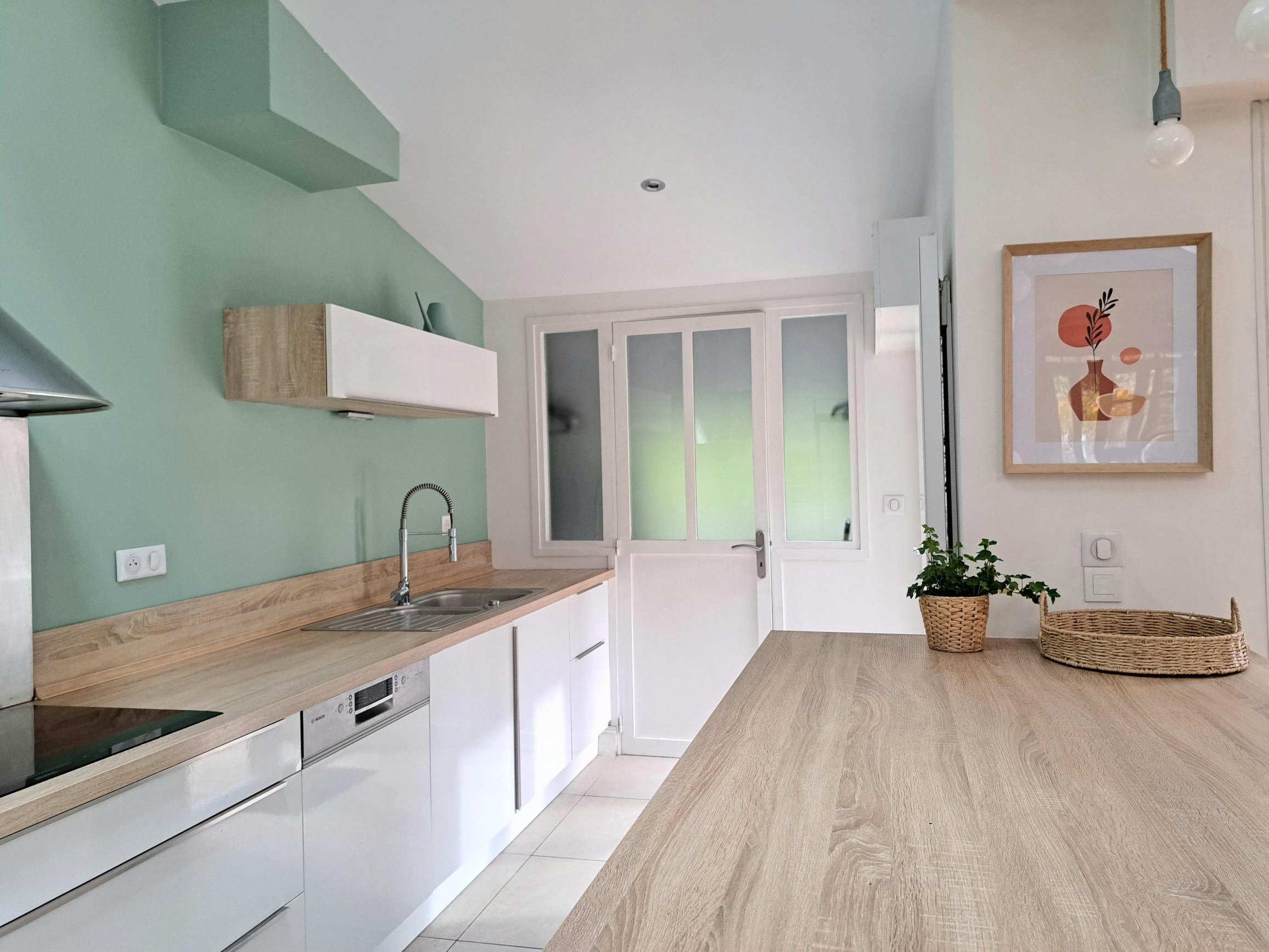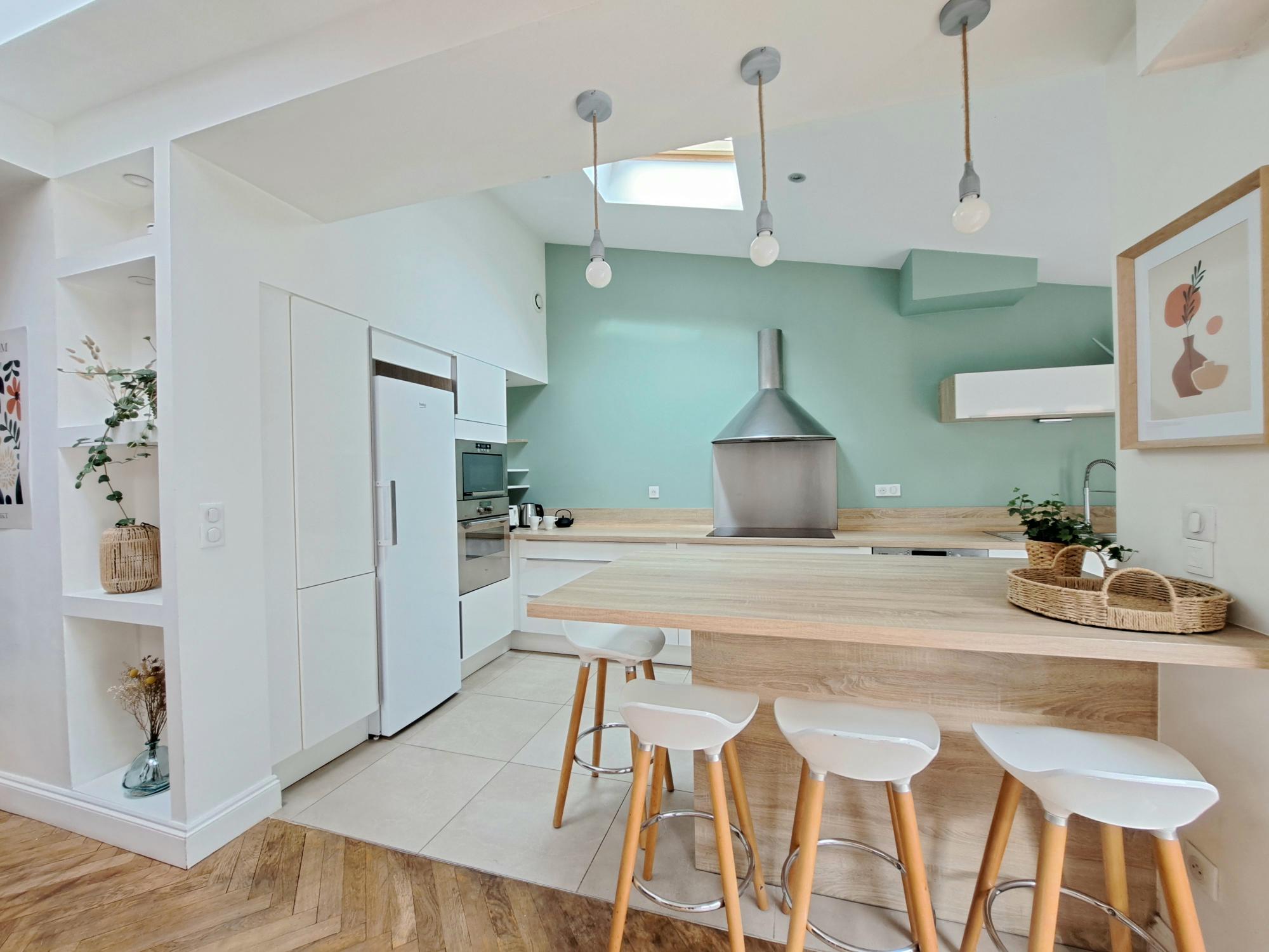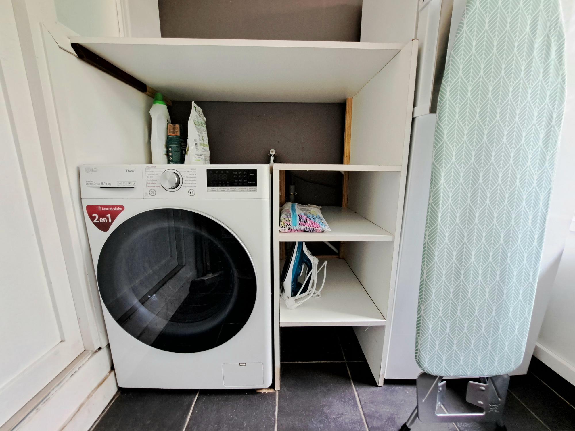 Sur la gauche, une cuisine ouverte toute équipée avec bar, puis un espace buanderie bénéficiant d’un combiné lave-linge et sèche-linge.