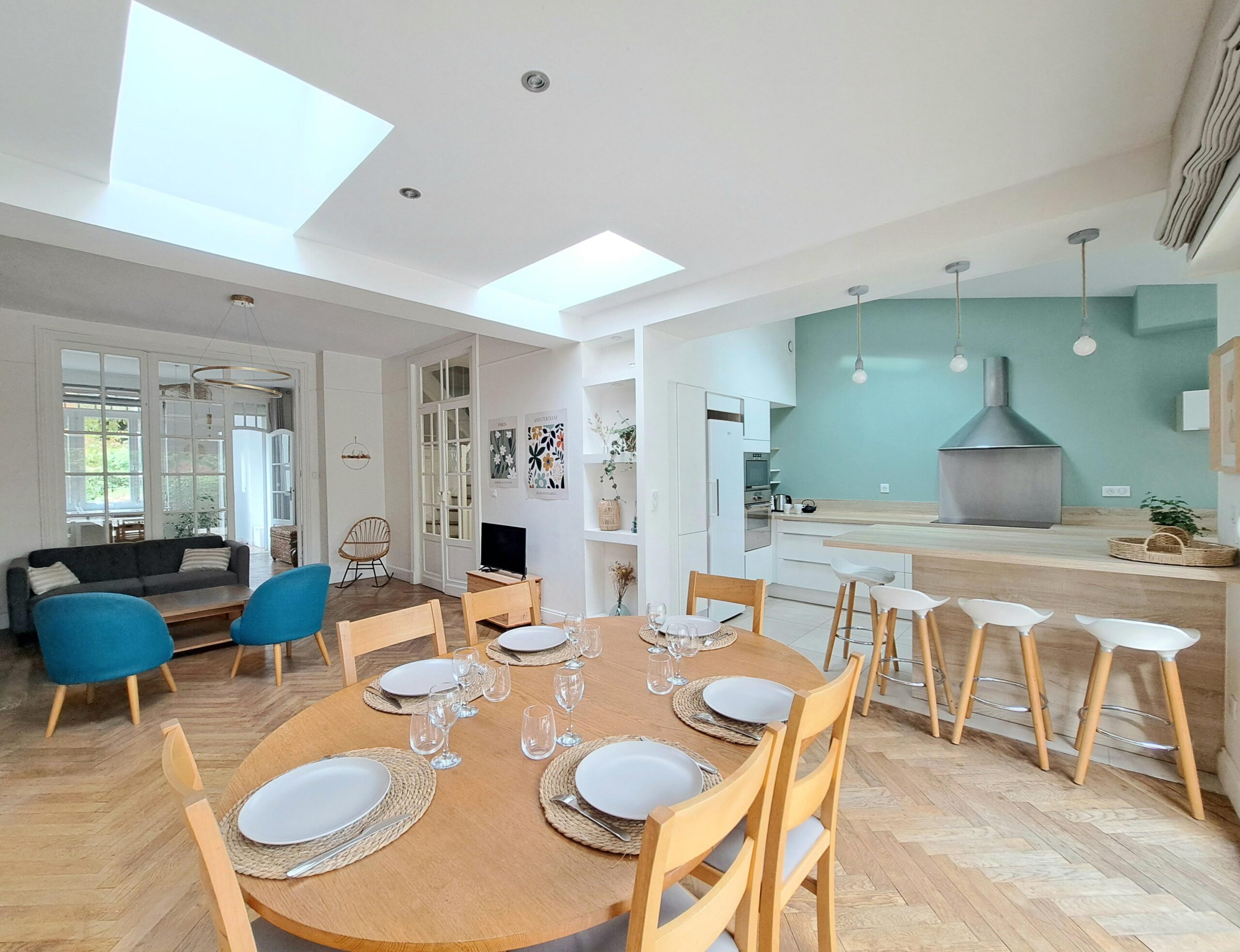De là, vous apercevrez la pièce de vie, illuminée par une large baie vitrée, et composé d’un salon avec cheminée (insert bois) et d’un espace avec table à manger pour 8 personnes.