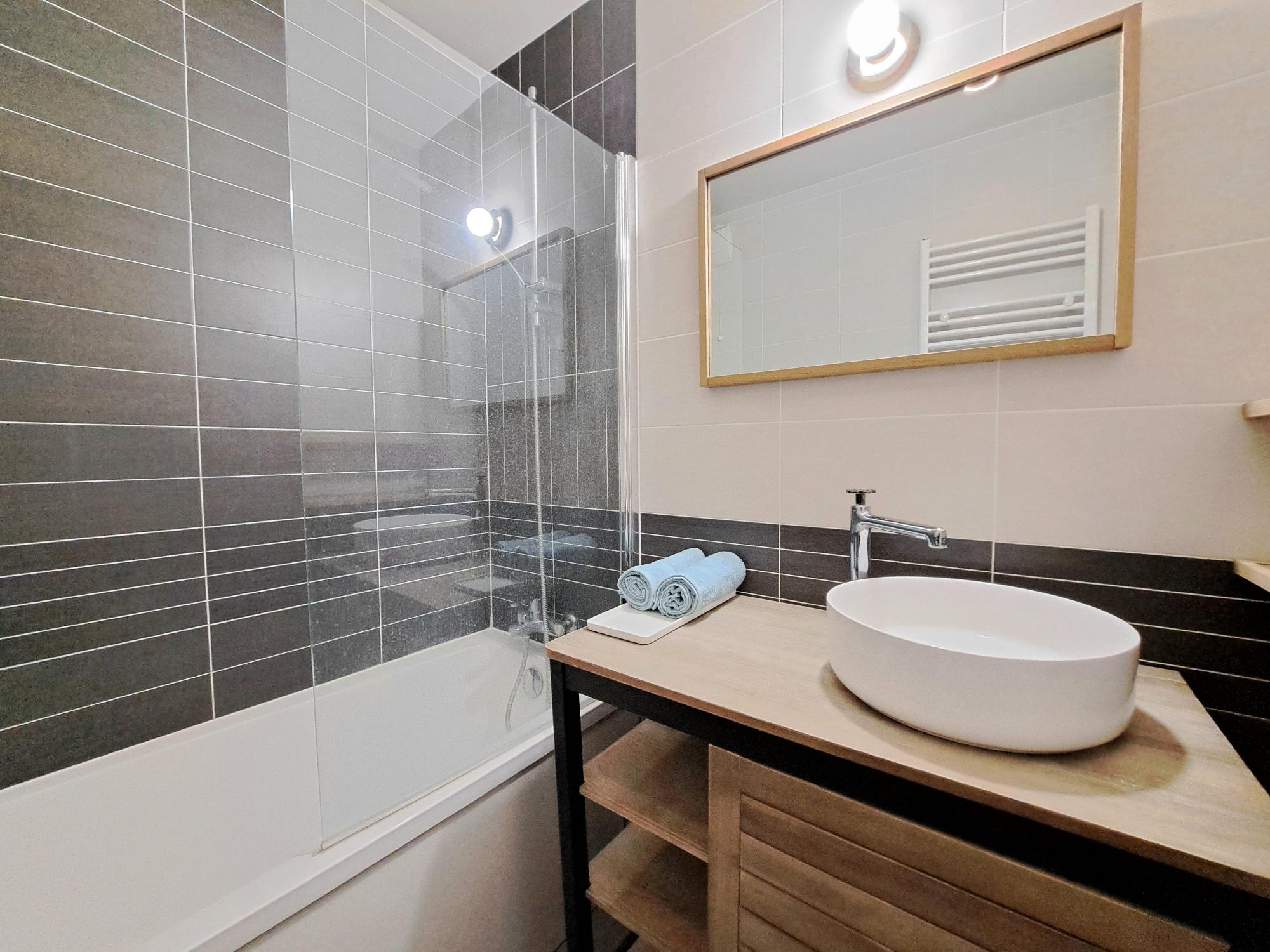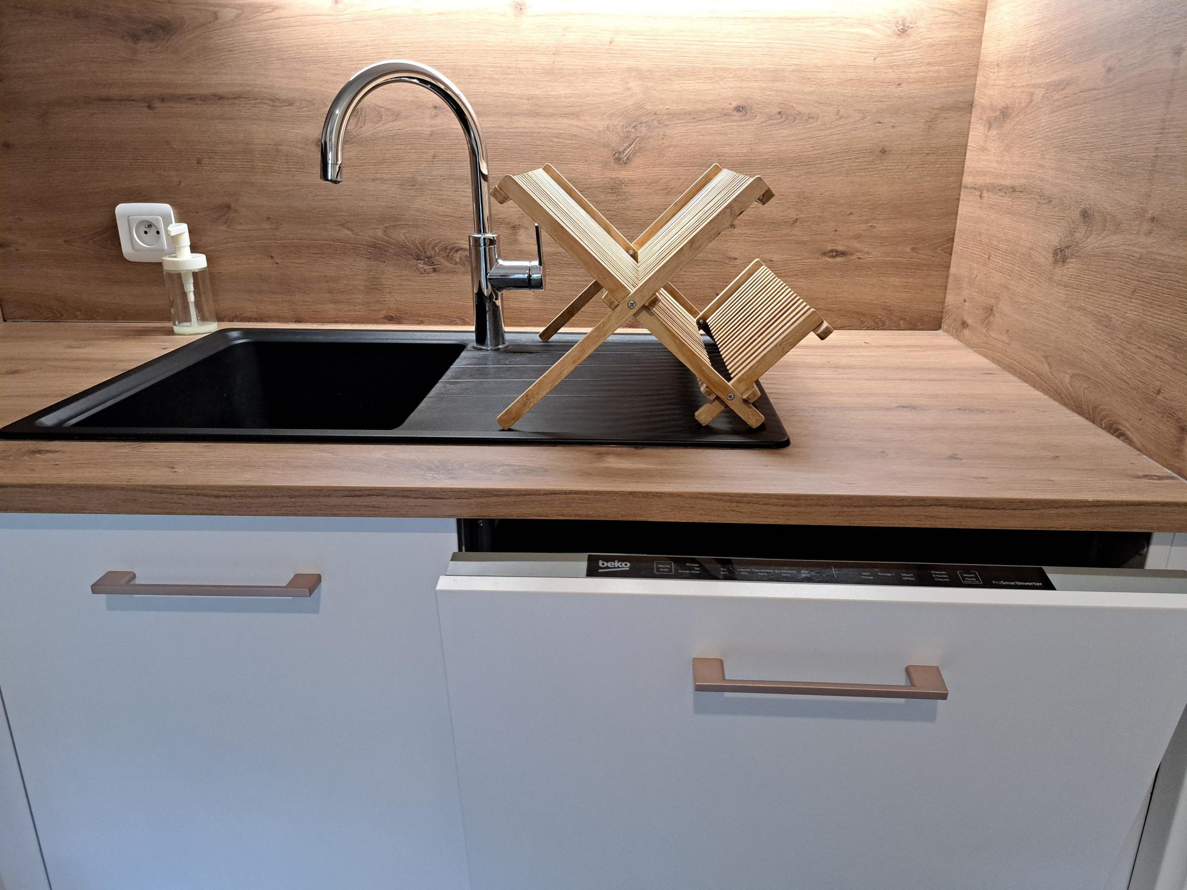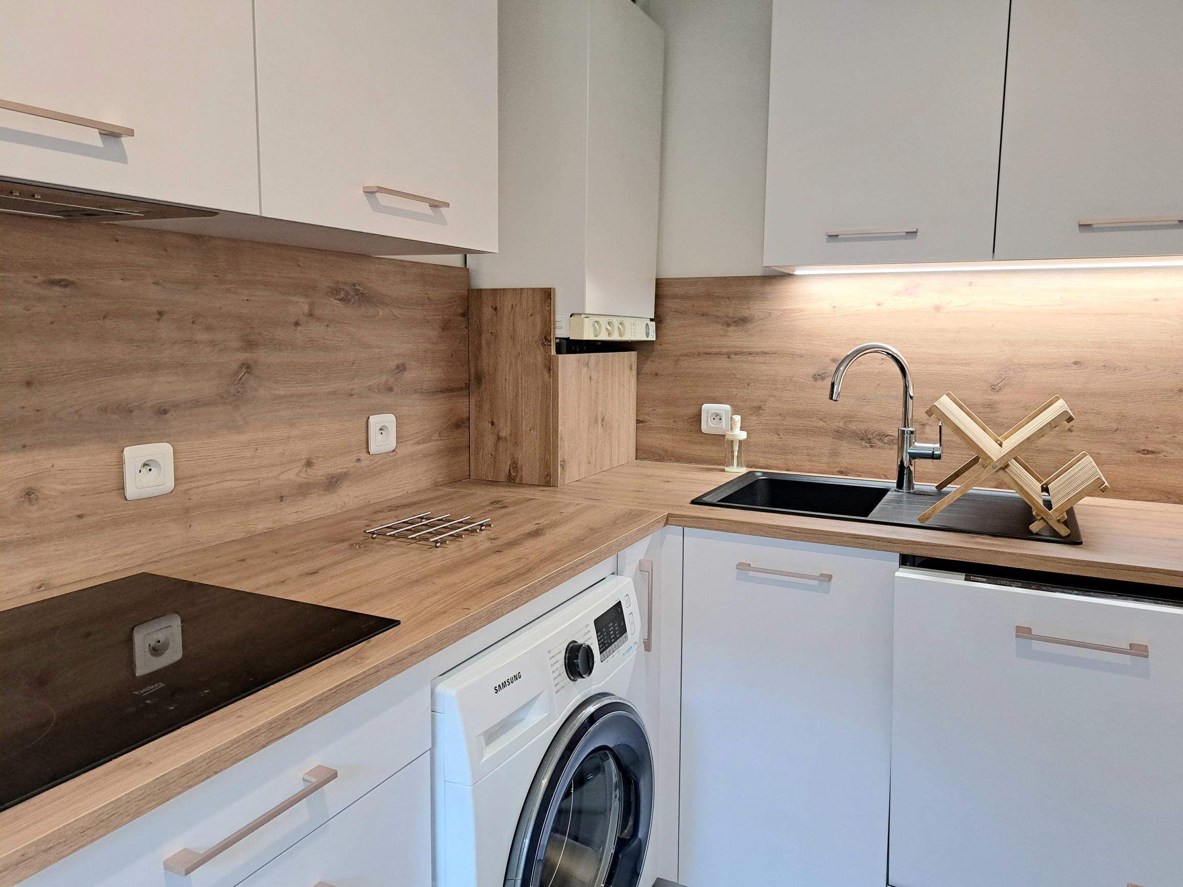 La cuisine moderne et fonctionnelle est entièrement équipée avec tout le nécessaire pour cuisiner en toute simplicité. La salle de bain offre une baignoire élégante ainsi qu’un espace raffiné, avec serviettes et linge de maison fournis pour votre confort.