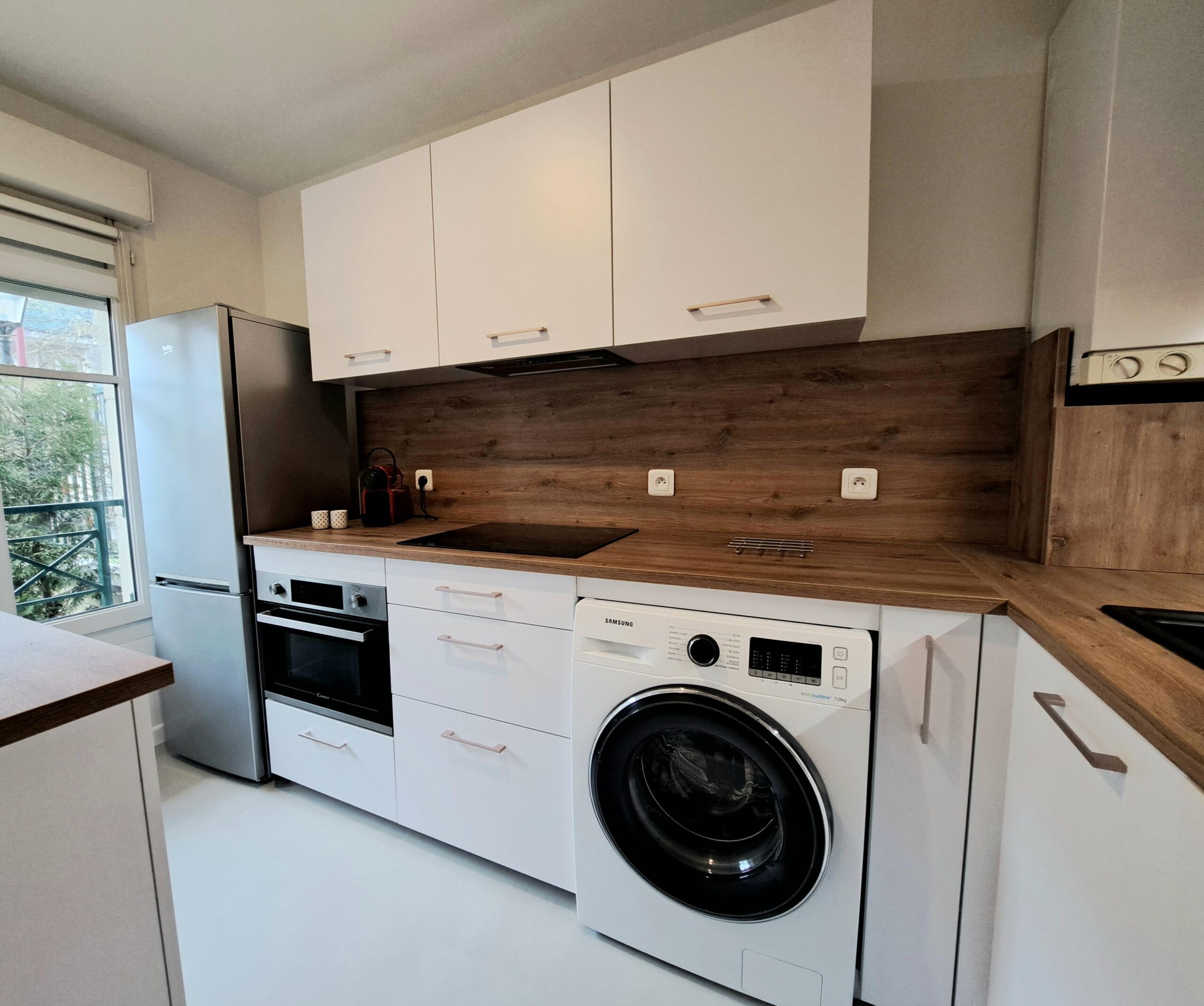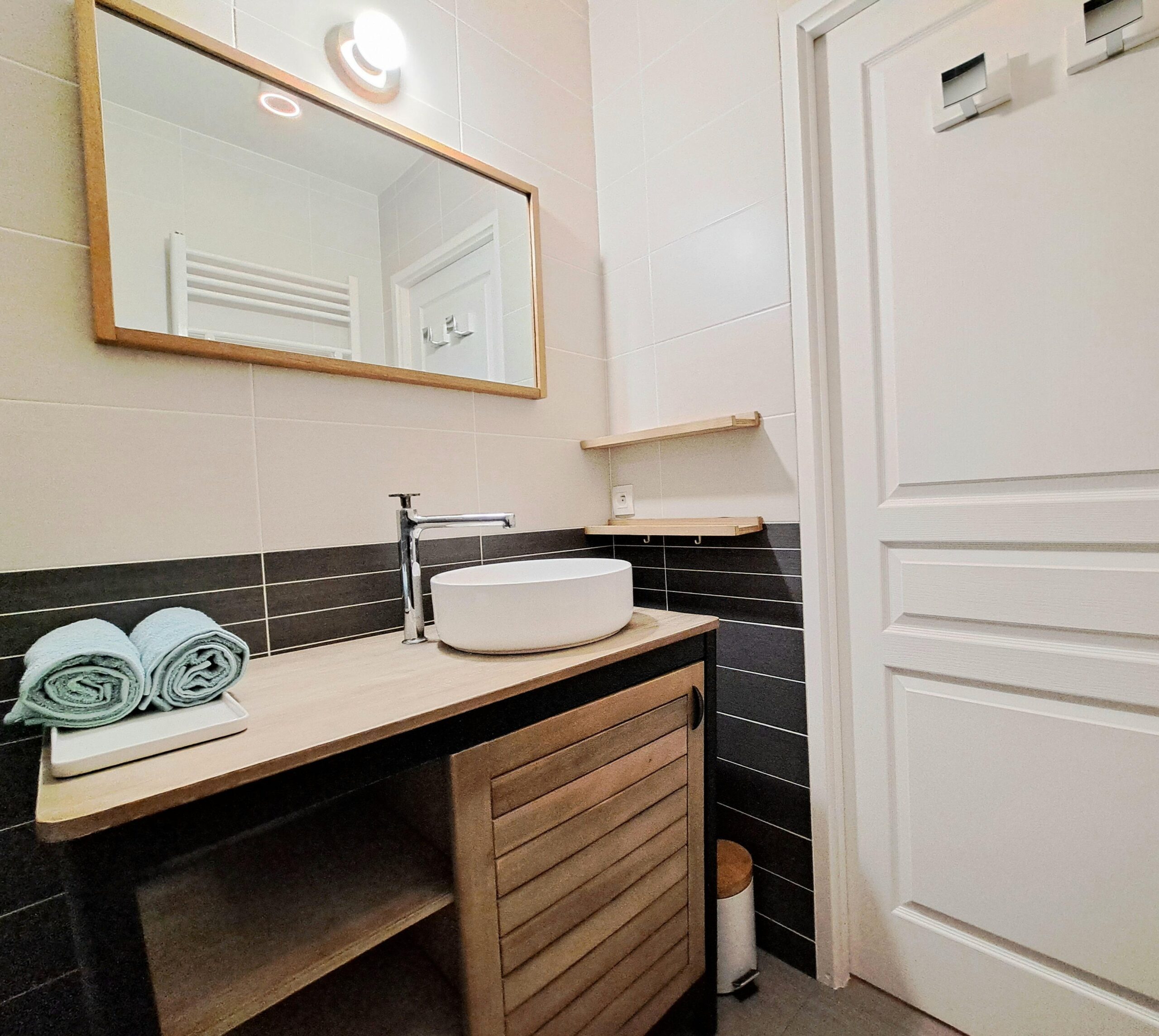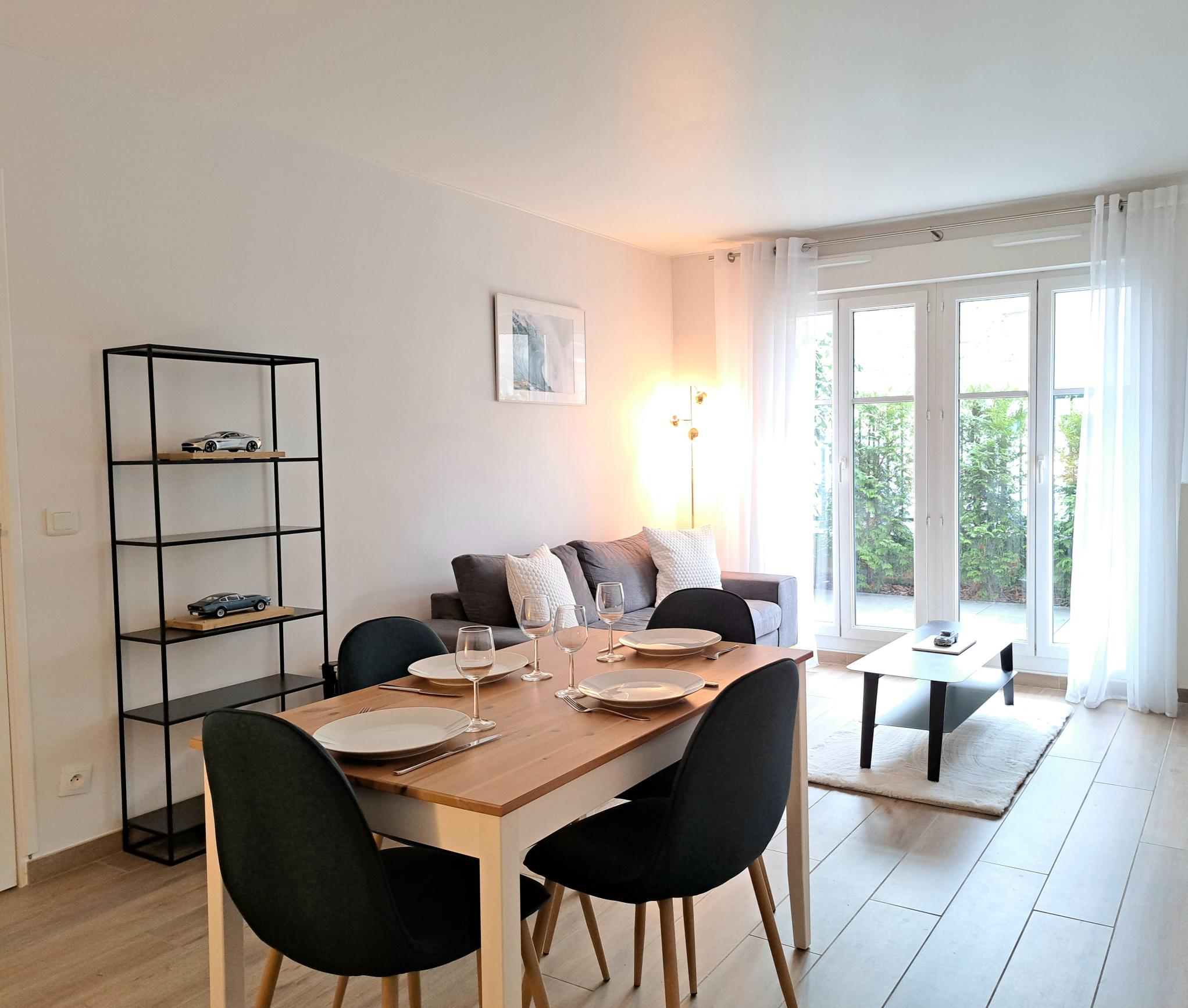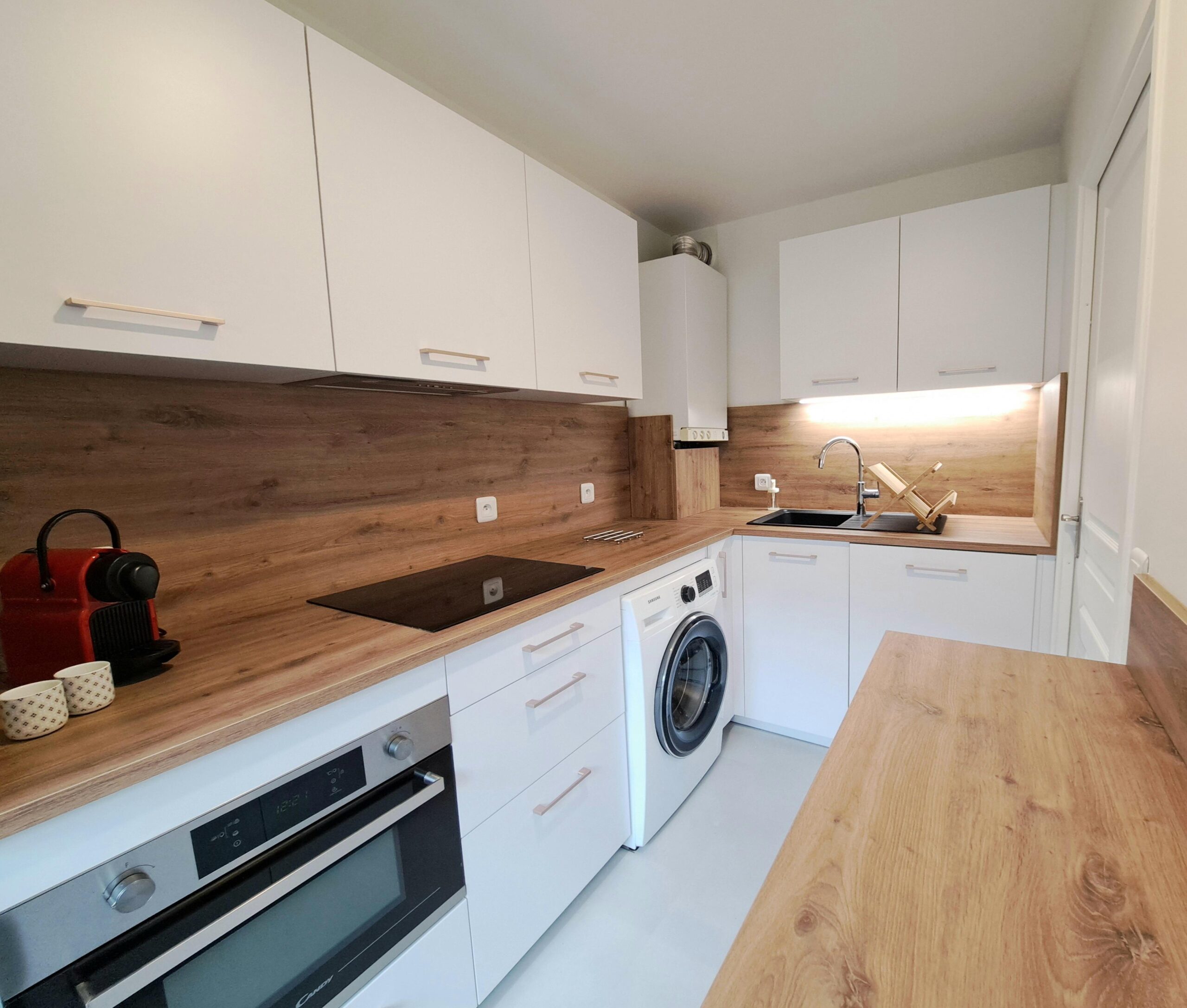 La cuisine moderne et fonctionnelle est entièrement équipée avec tout le nécessaire pour cuisiner en toute simplicité. La salle de bain offre une baignoire élégante ainsi qu’un espace raffiné, avec serviettes et linge de maison fournis pour votre confort.