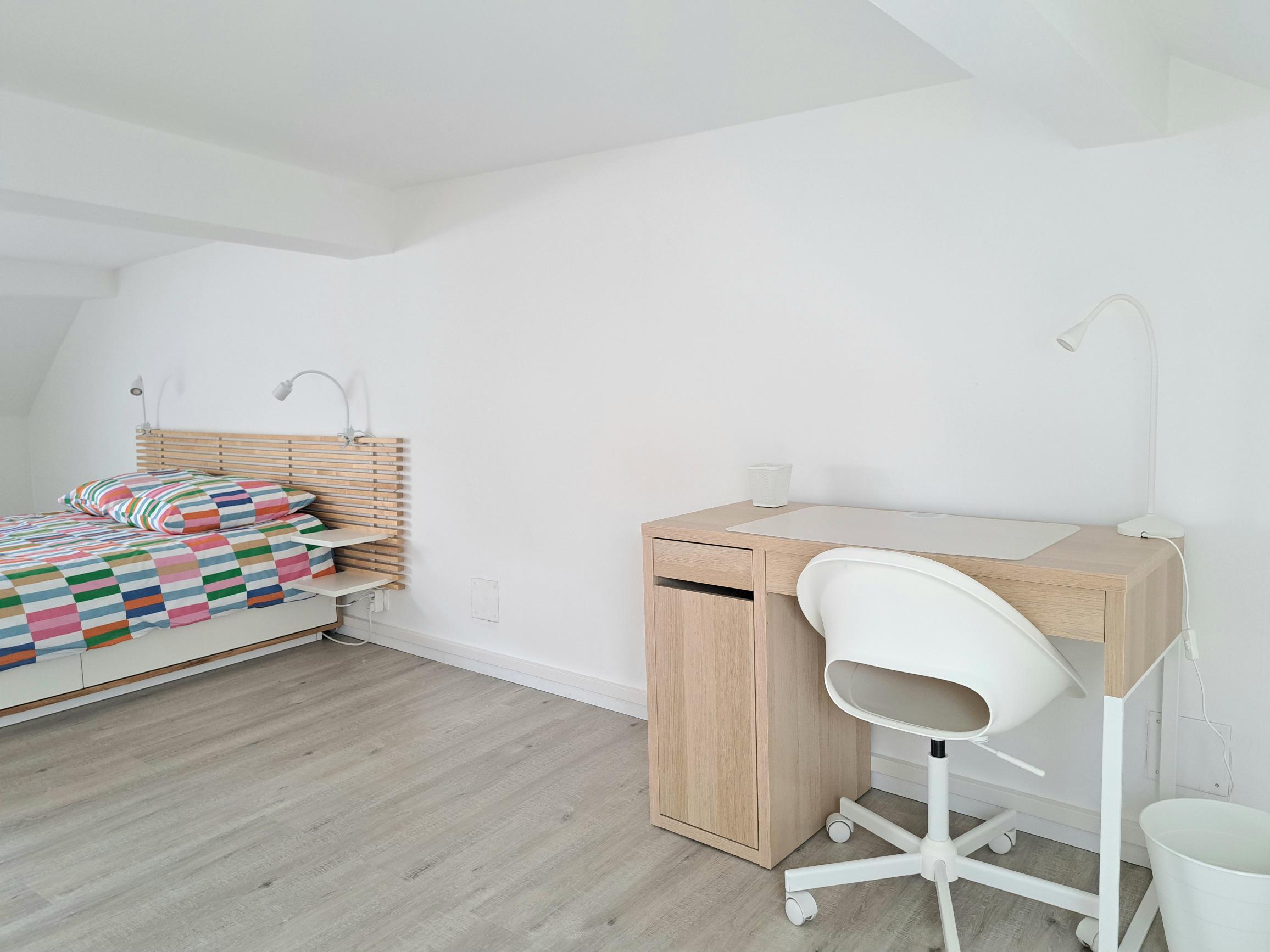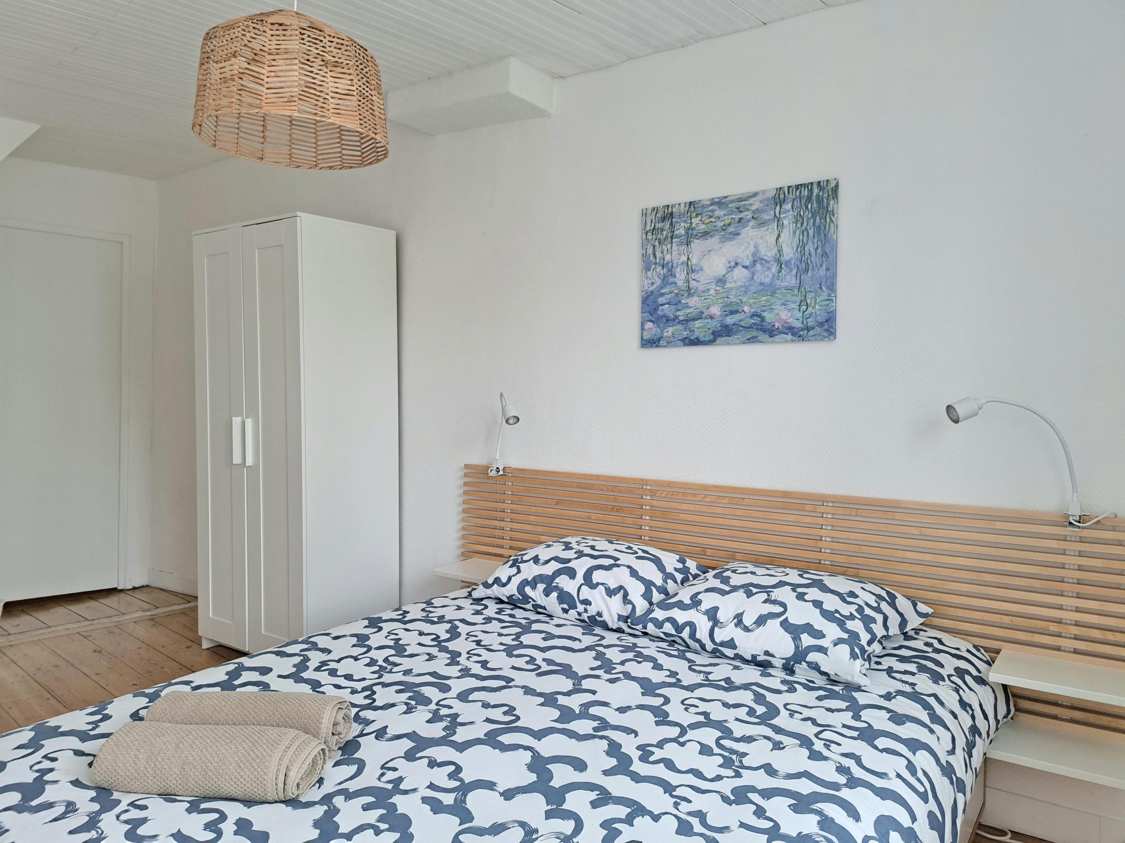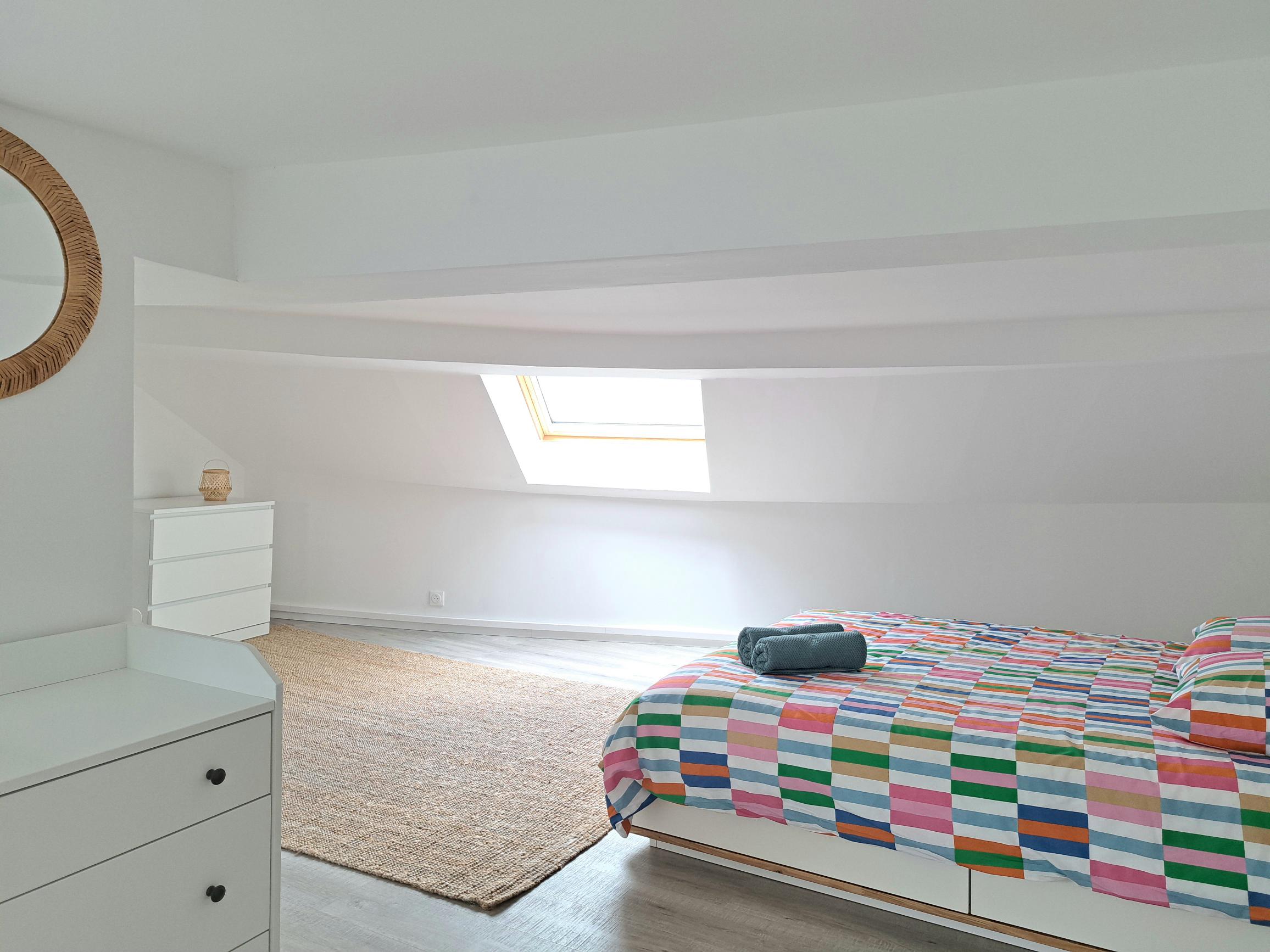 L’appartement est équipé pour y accueillir 6 personnes. Il se trouve au premier étage sans ascenseur. Vous devez y accéder par des escaliers confortables à monter. Le logement se trouve au numéro 201. Lorsque vous rentrez vous découvrirez une cuisine tout équipée, un espace repas , avec un espace salon équipé d’un canapé convertible 140×190 . Au même étage vous avez une chambre avec lit de 2 personnes 160×200, une grande salle de bain avec une baignoire d’angle, un lavabo et un toilette. A l’étage vous avez une seconde chambre, mansardée, équipée d’un lit 2 personnes 160×200. toutes les 2 sont équipées d’un espace de travail et des rangements pour votre confort.