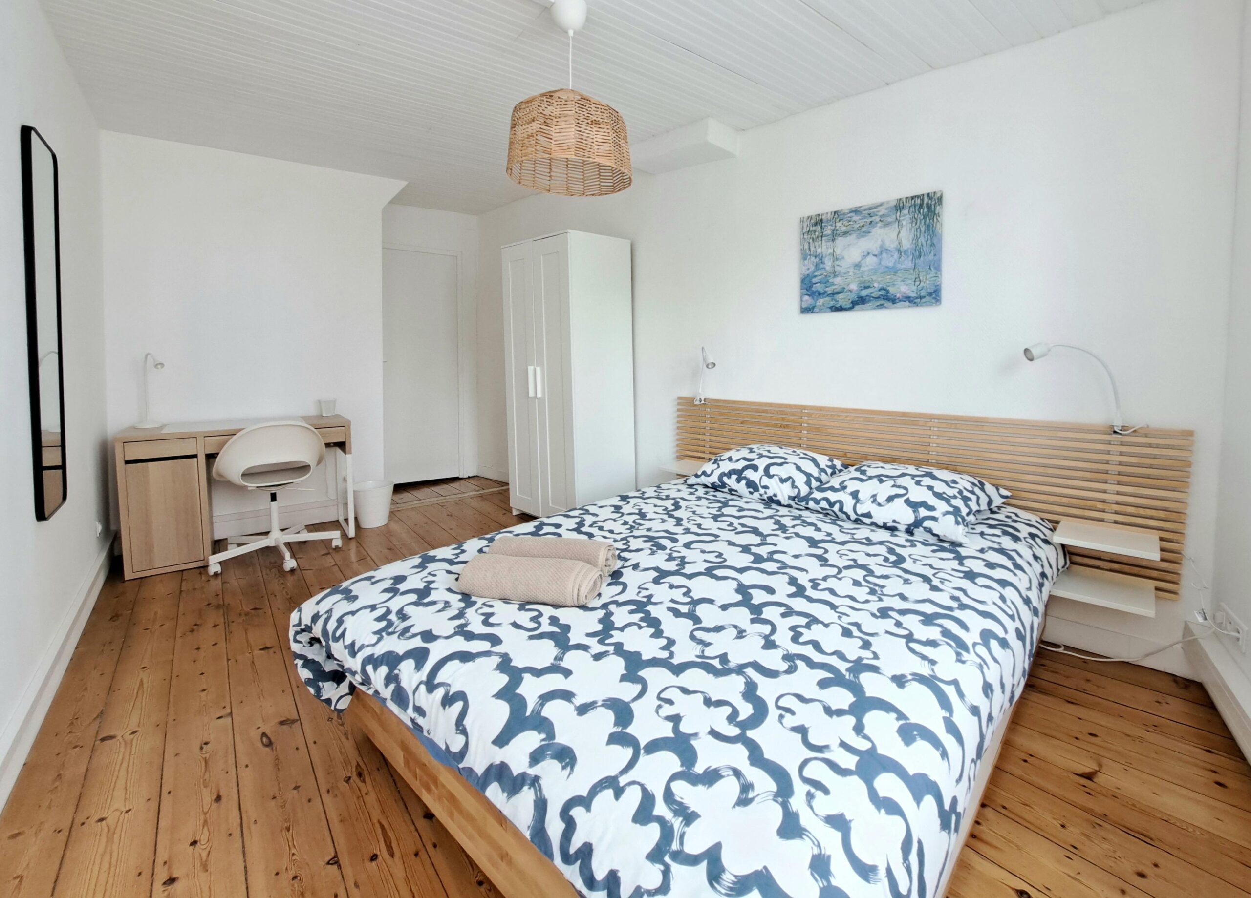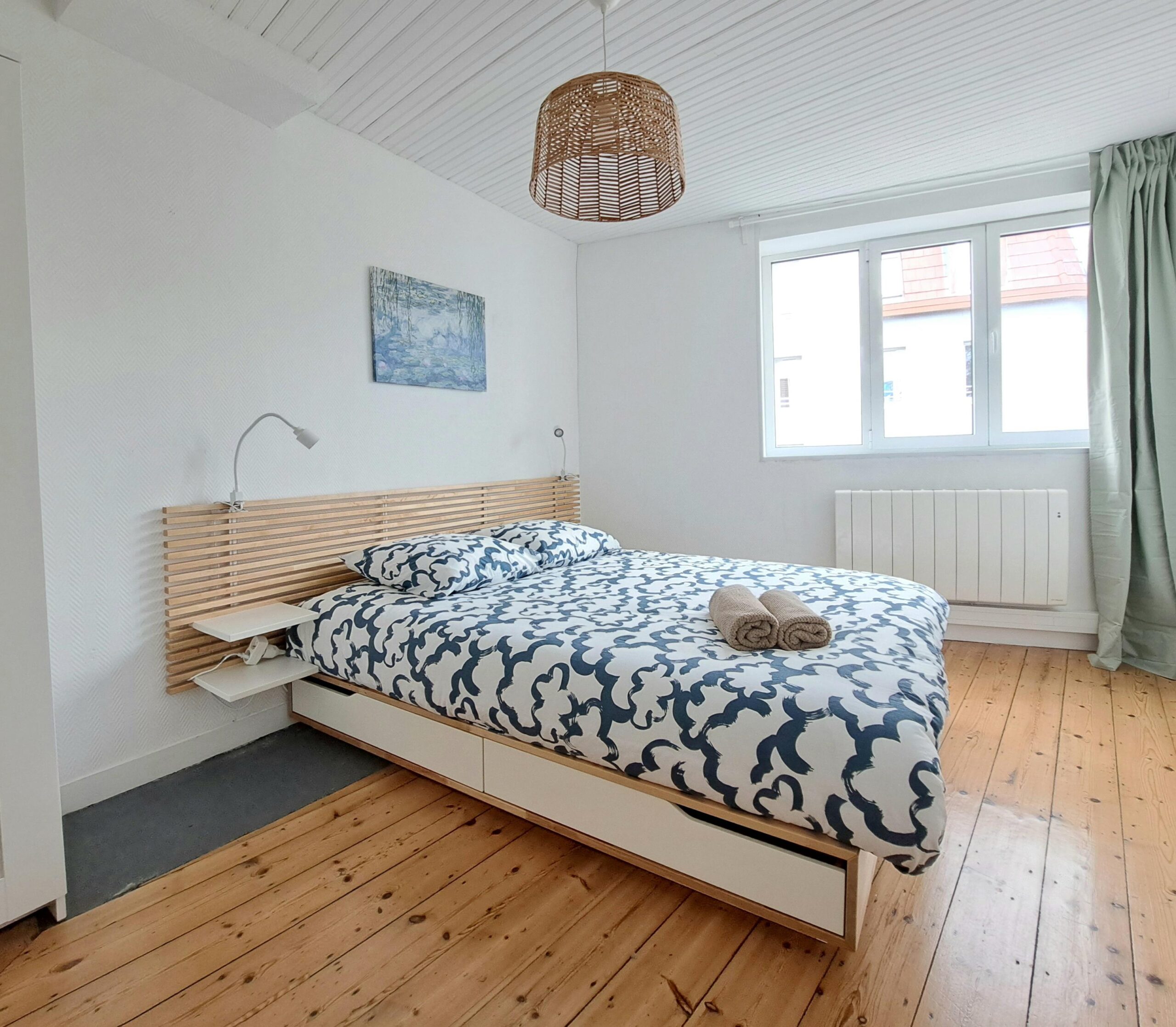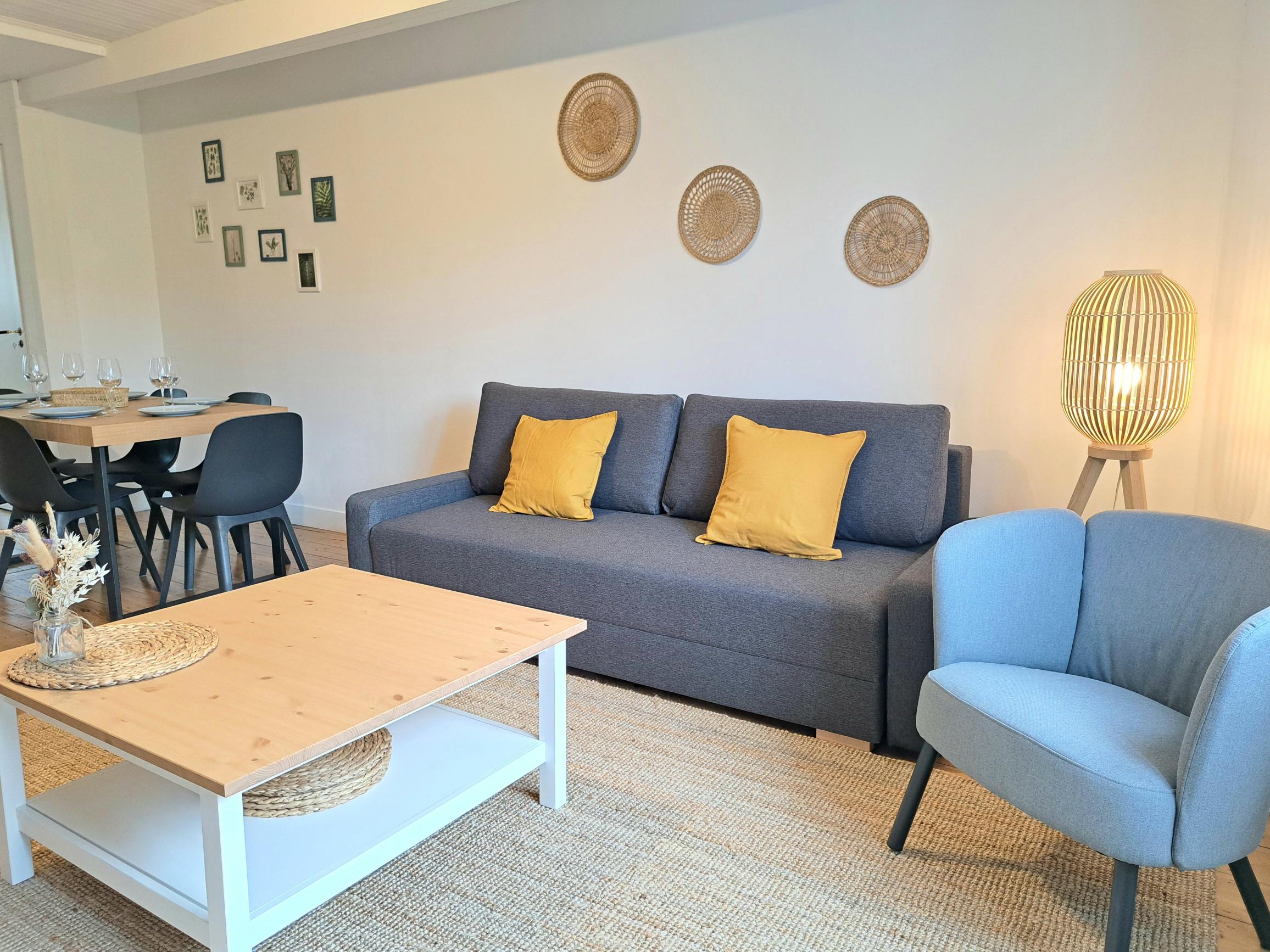 L’appartement est équipé pour y accueillir 6 personnes. Il se trouve au premier étage sans ascenseur. Vous devez y accéder par des escaliers confortables à monter. Le logement se trouve au numéro 201. Lorsque vous rentrez vous découvrirez une cuisine tout équipée, un espace repas , avec un espace salon équipé d’un canapé convertible 140×190 . Au même étage vous avez une chambre avec lit de 2 personnes 160×200, une grande salle de bain avec une baignoire d’angle, un lavabo et un toilette. A l’étage vous avez une seconde chambre, mansardée, équipée d’un lit 2 personnes 160×200. toutes les 2 sont équipées d’un espace de travail et des rangements pour votre confort.